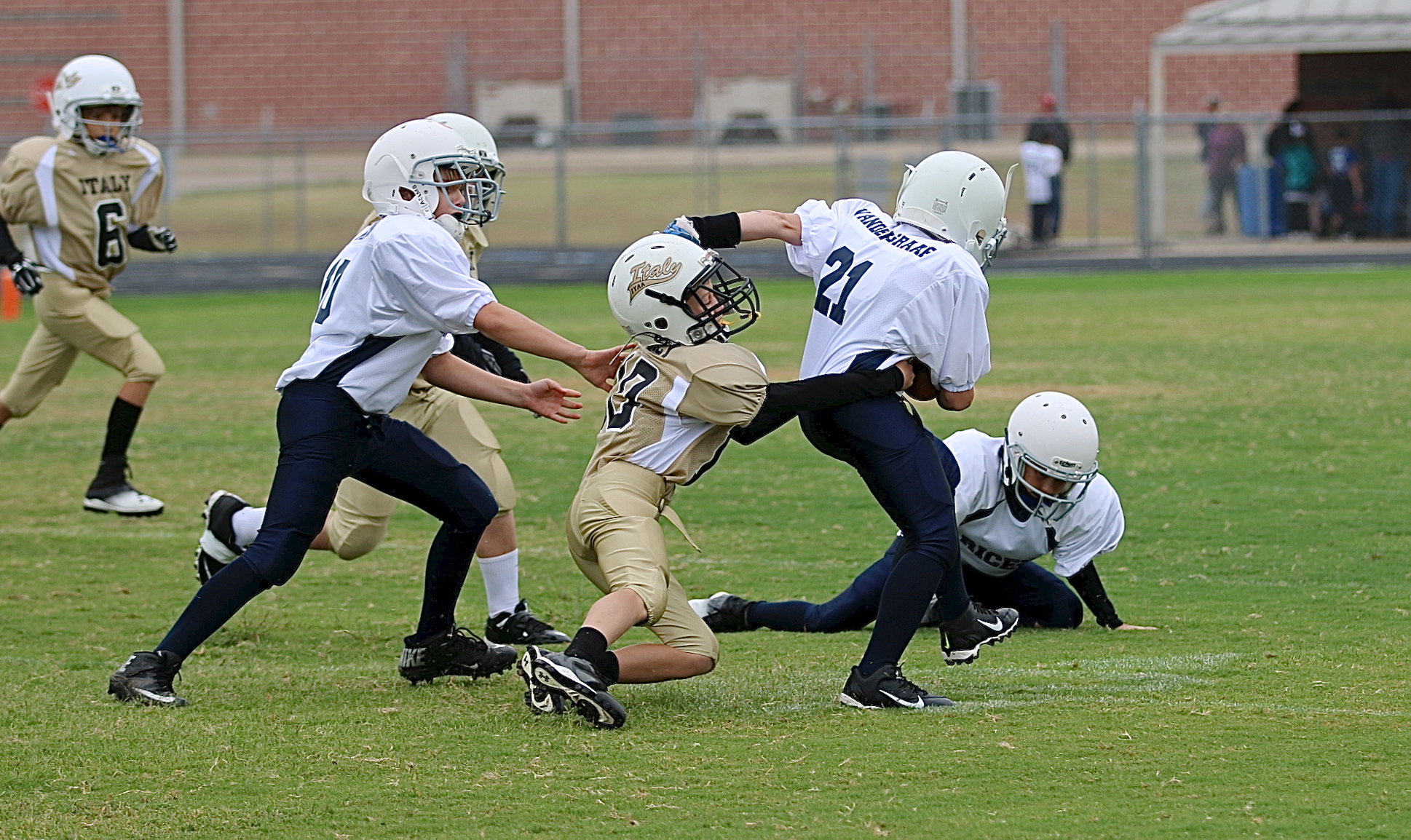 IYAA opens 2014 football season with three away games against Rice « previous story album next » A-team Gladiator Ty Cash(10) latches on to a Bulldog runner. (Barry Byers) Download original photo