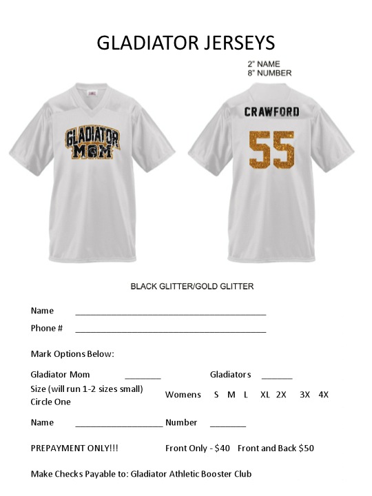 Booster Club has shirts and more for sale during Friday Night home games « previous story album next » Custom Gladiator Jerseys Order Form from the Gladiator Athletic Booster Club. (Submitted photo) Download original photo