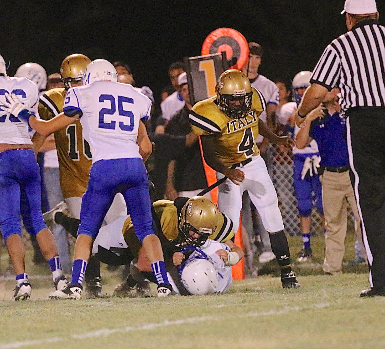 Italy defeats Frost 35-19 at Willis Field « previous story album next » Italy’s Kyle Fortenberry(66) finishes off a tackle against a hapless Frost ball carrier. (Barry Byers) Download original photo