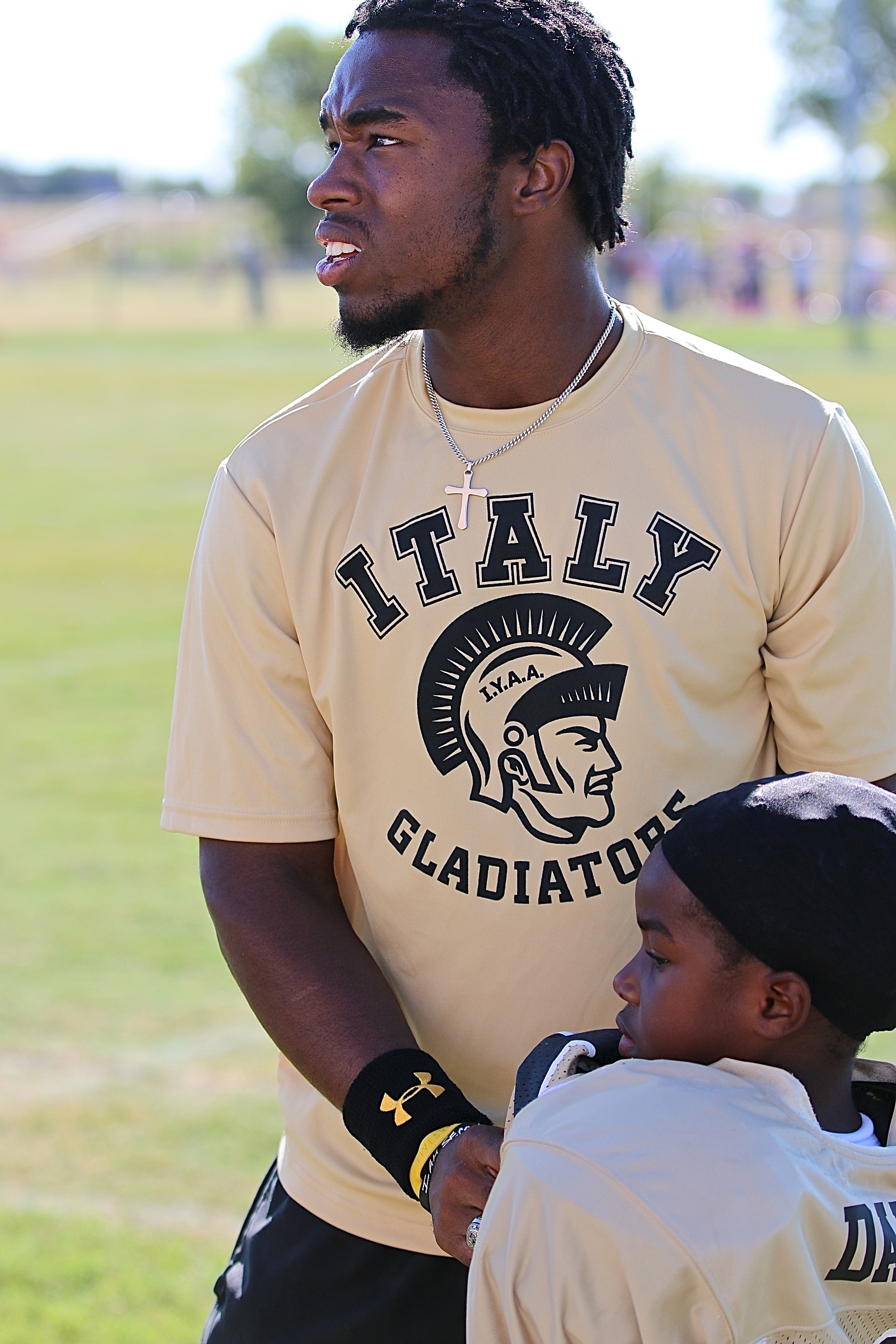IYAA Football and Cheer wins 2-of-3 over Mildred during first home games « previous story album next » IYAA C-team Gladiator head coach Jasenio Anderson helps Elijah Davis(18) buckle up for the battle against Mildred. (Barry Byers) Download original photo