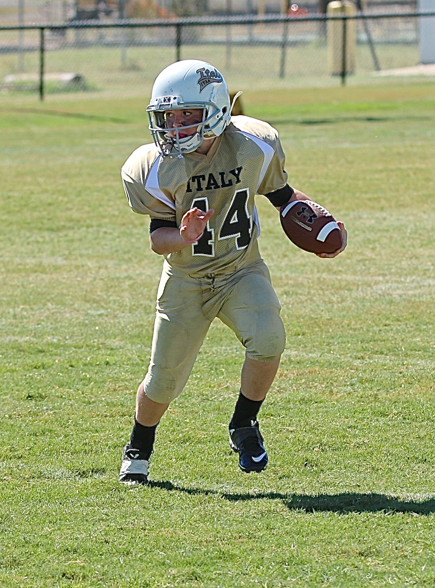 Enjoy more action shots from the IYAA’s first home football games of 2014 « previous story album next » Bryce DeBorde(44) tries to get the edge against Mildred’s defense. (Barry Byers) Download original photo