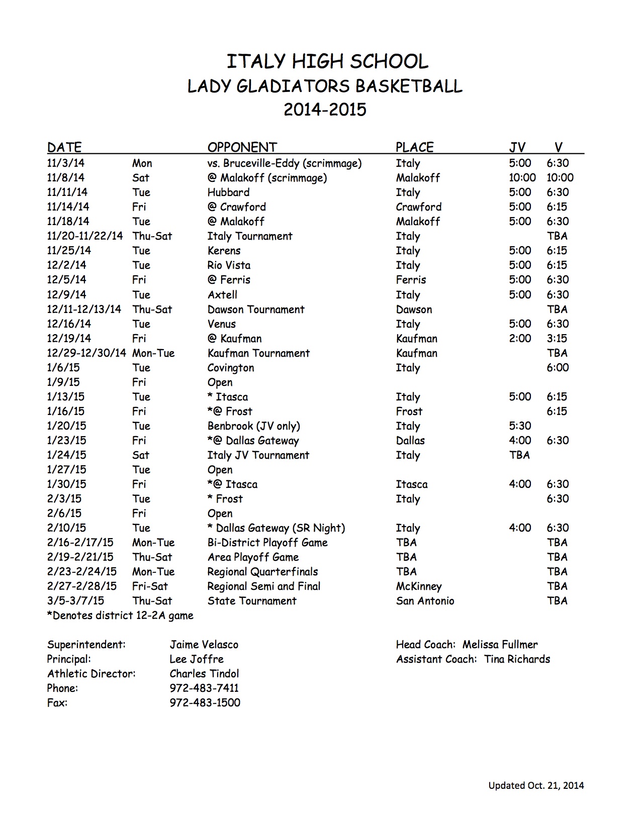 Italy AD releases Varsity/JV/JH basketball schedules for 2014-2015 « previous story album next » Lady Gladiator Basketball Schedule — JV & Varsity Download original photo