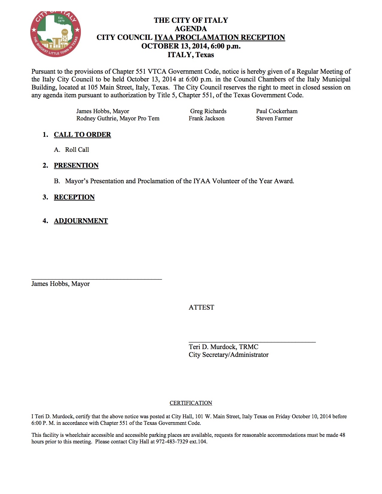 Agenda: Italy City Council Meeting—Monday, October 13, 2014 « previous story album next » Proclamation Reception Download original photo
