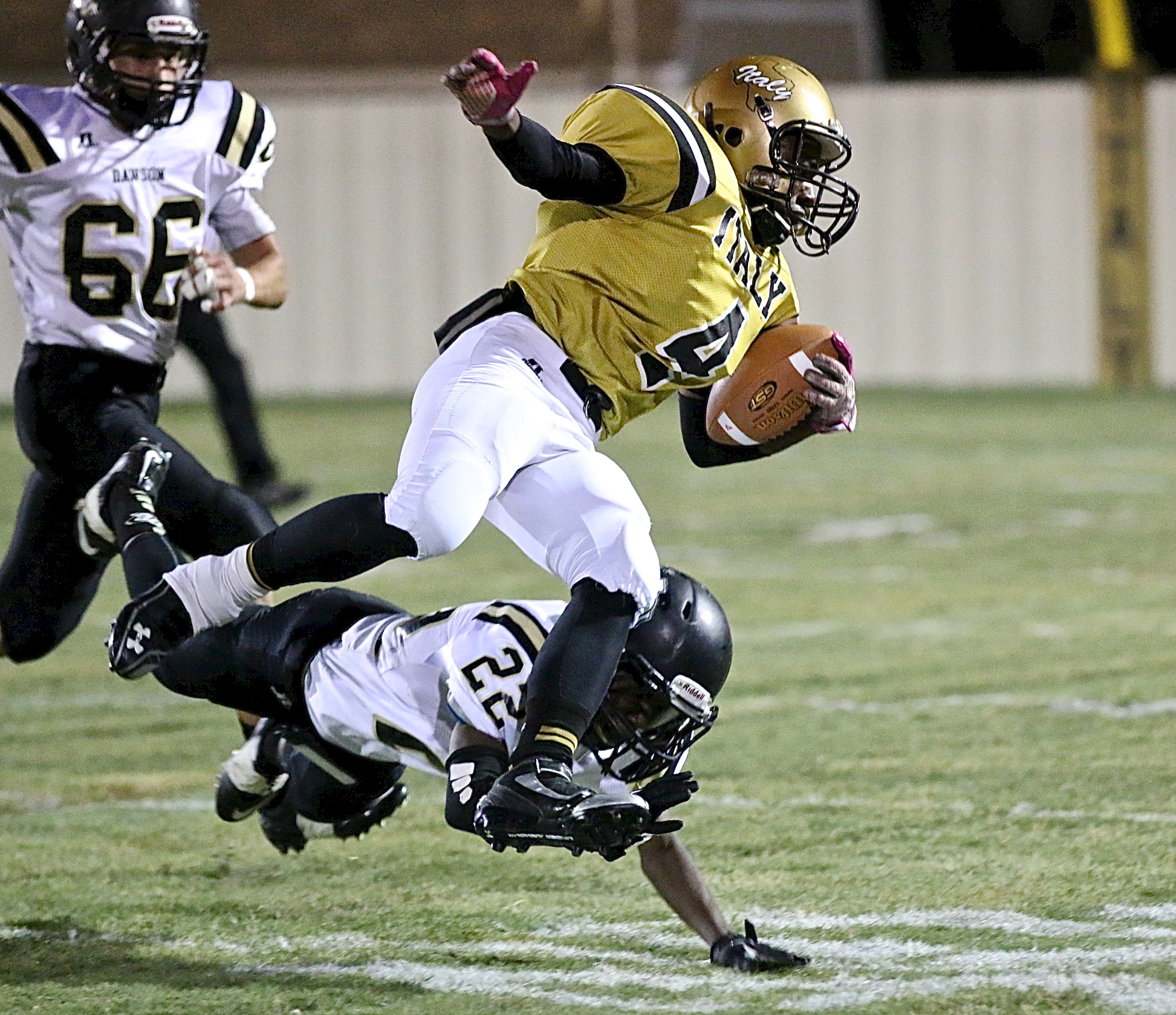 Gladiators run over Dawson 48-26 for homecoming win; Celis rushes for 249, 3 TDs « previous story album next » Kendrick Norwood(4) is finally tripped up by a Bulldog nipping at his heels after a nice gain for the Gladiators. (Barry Byers) Download original photo