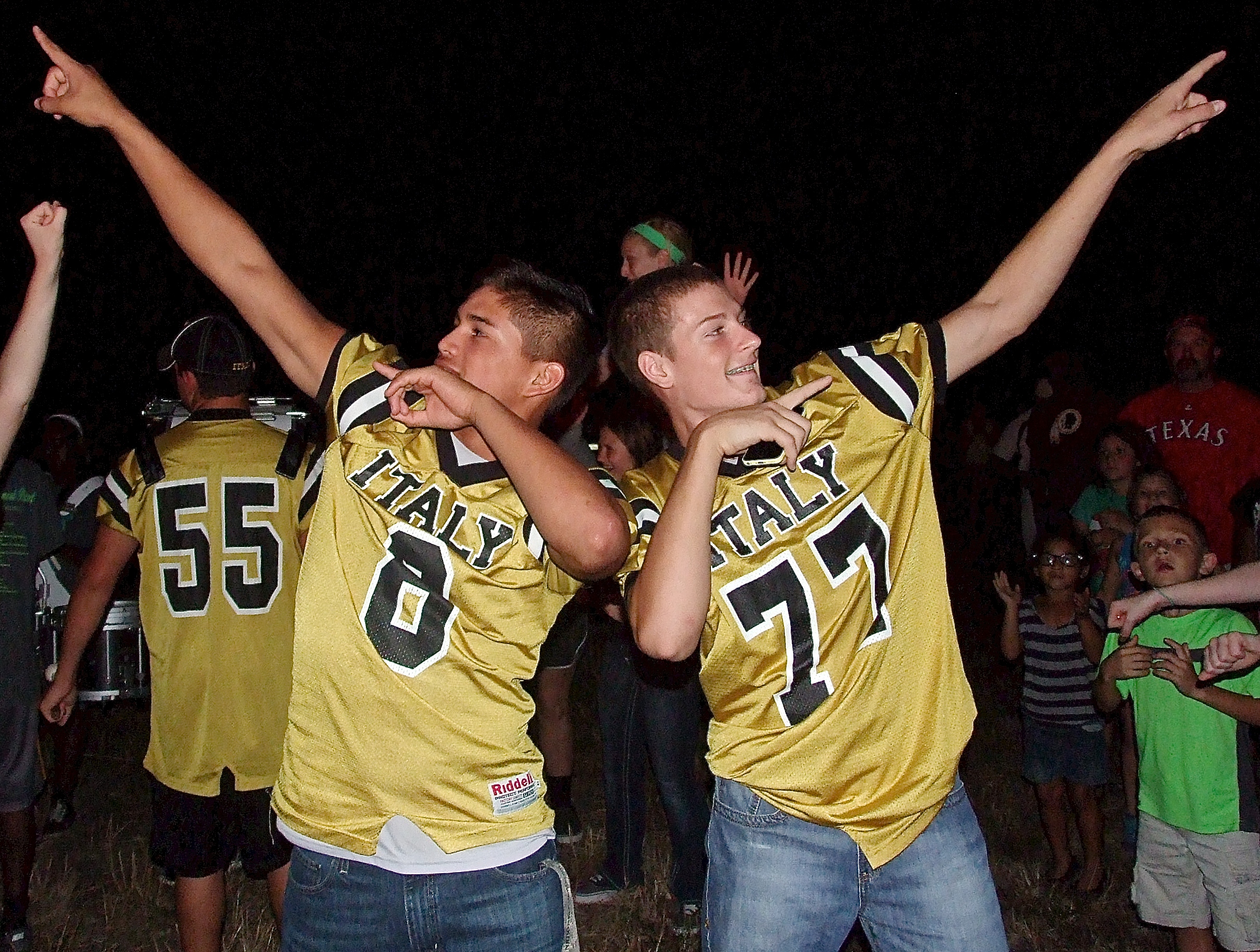 A Bonfire, Parade and Pep-Rally set the tone for a grande finale against Dawson « previous story album next » Joe Celis(8) and Clay Riddle(77) sport classic Gladiator battle posses in preparation for Italy’s homecoming duel against Dawson. (Barry Byers) Download original photo