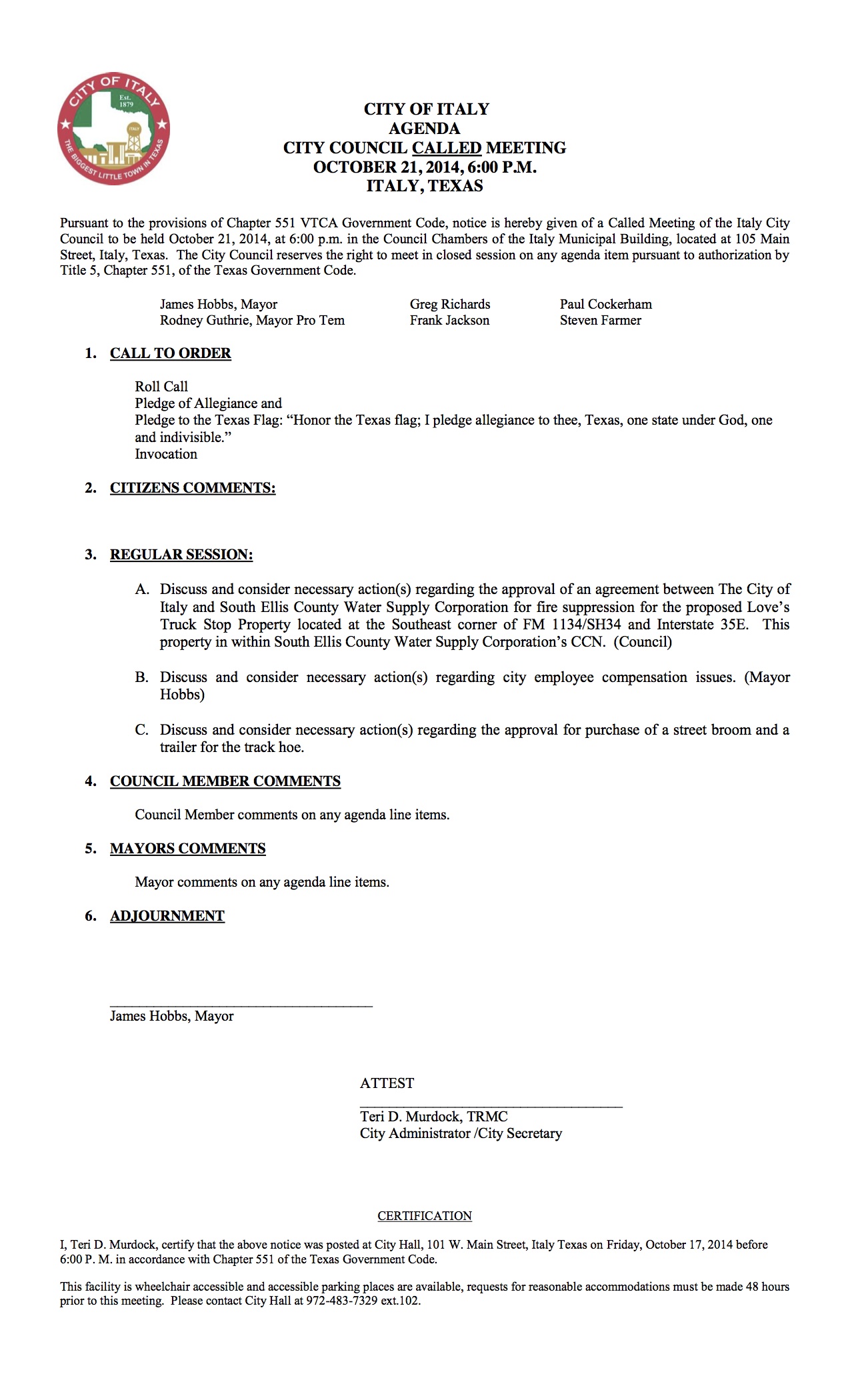 Agenda: Italy City Council Called Meeting — Tuesday, October 21, 2014 « previous story album next » Download original photo