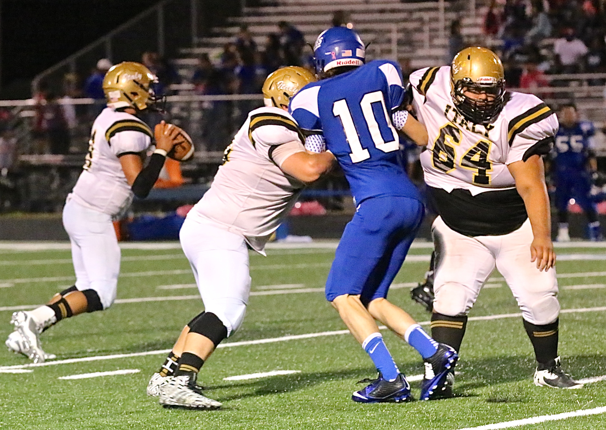 The Gladiators continue the fight against the Chilton Pirates « previous story album next » Chilton’s Caleb Karl(10) is a few burgers shy of splitting this double-team applied by Italy’s John Byers(60) and Ty Fernandez(64). (Barry Byers) Download original photo