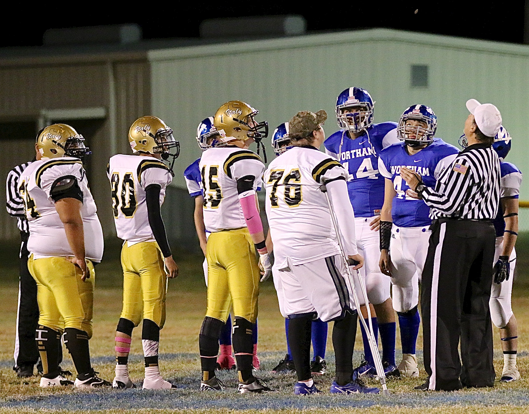 The Italy Gladiators slam the Wortham Bulldogs into submission, 14-7 « previous story album next » Gladiator senior captains Ty Fernandez(64), Jack Hernandez(80), Cody Boyd(15) and Colin Newman(76) represent the gold and white during the pre-game coin toss. (Barry Byers) Download original photo