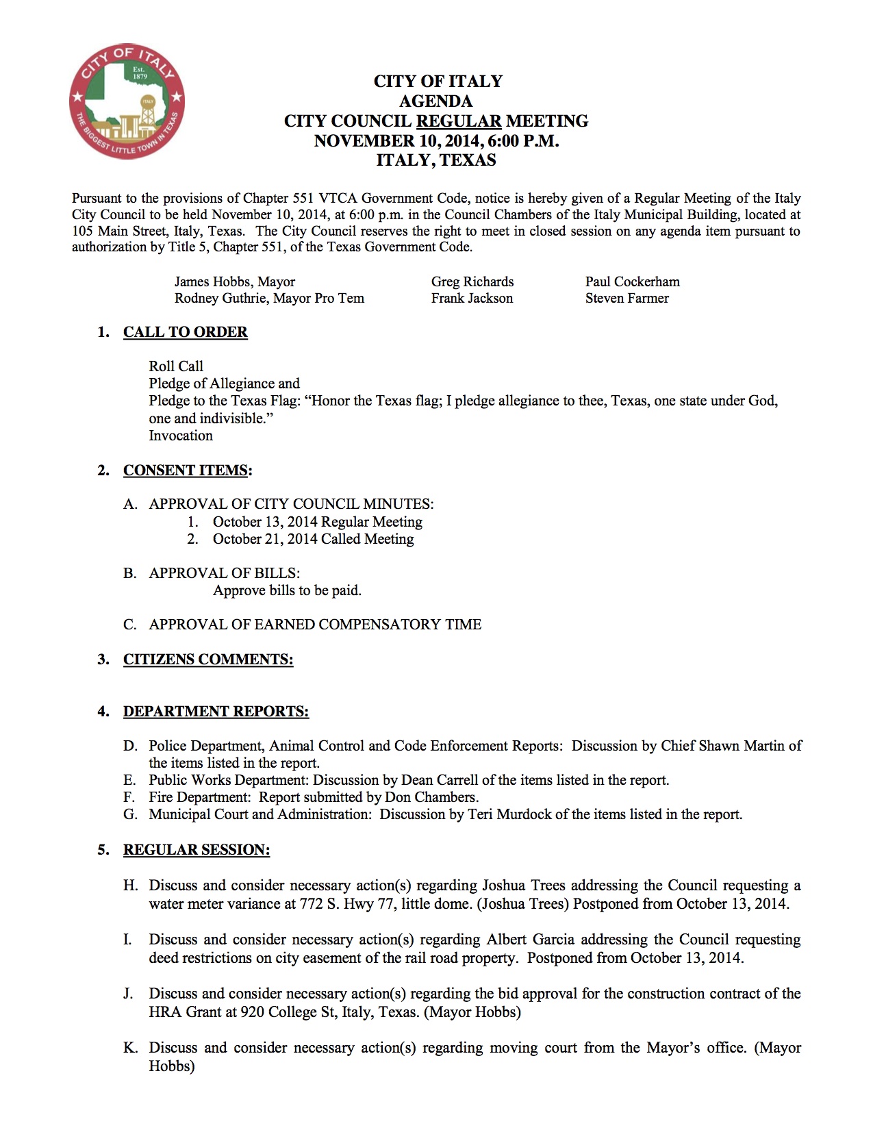 Agenda: Italy City Council Meeting – Monday, November 10, 2014 « previous story album next » Agenda – page 1 Download original photo