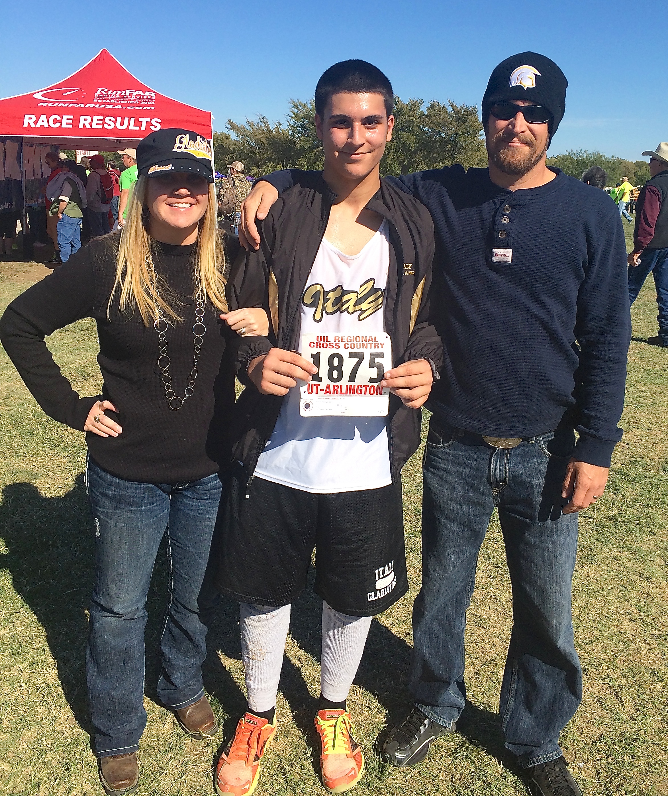 Italy High School junior Gladiator Mason Womack (#1875) represented the Gladiators as the first male cross country runner to compete at UIL regionals in recent times. Here, Womack is pictured with his parents Michelle and Troy Kowalsky during the event which was hosted by the University of Texas at Arlington. (Submitted photo)