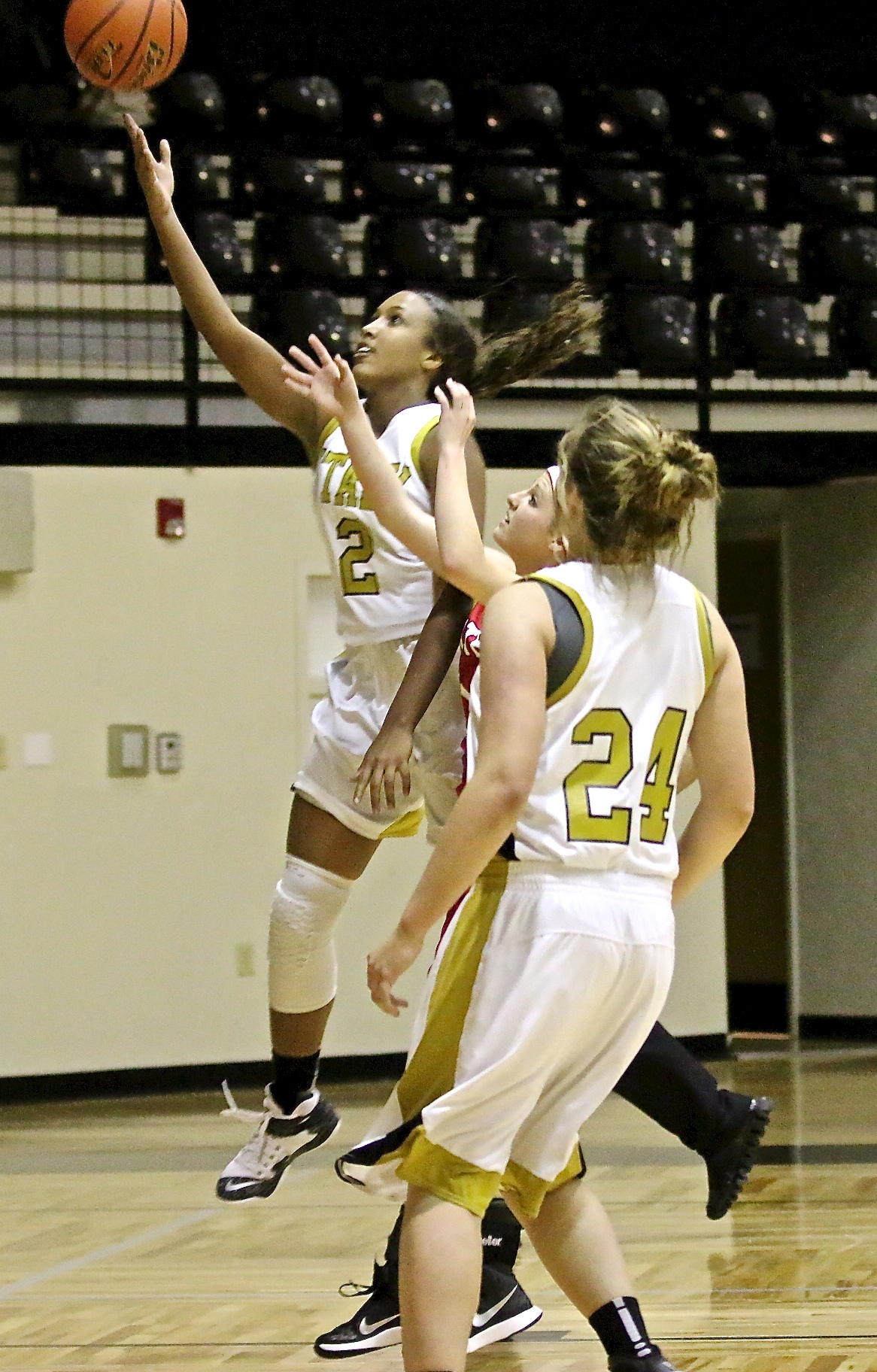 Lady Gladiators improve record to 10-3 « previous story album next » Italy’s Emmy Cunningham(2) swoops in with a finger roll as teammate Lillie Perry(24) trails the play. (Barry Byers) Download original photo