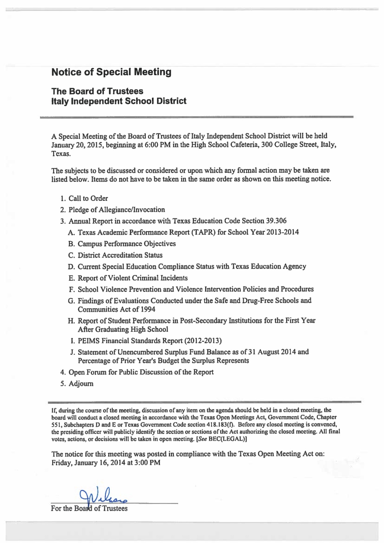 Agendas: Italy ISD School Board Special & Regular Meeting-Tuesday, Jan 20, 2015 « previous story album next » Agenda: Special Called Meeting Download original photo