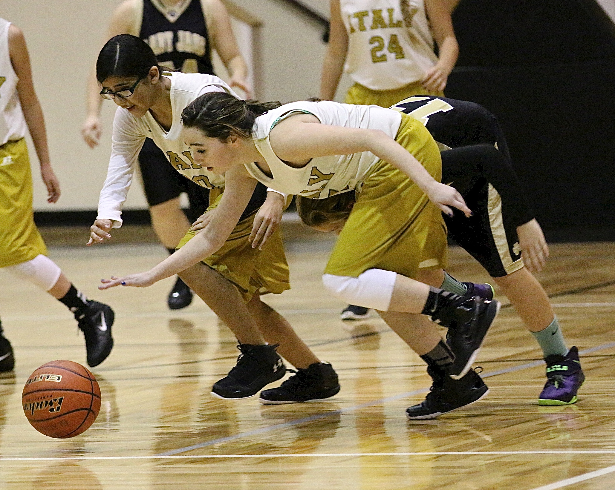 Italy’s Junior High Girls hoop it up against visiting Hubbard « previous story album next » Italy A team payers Andrea Galvan(20) and Madison Galvan(4) chase after a loose ball. (Barry Byers) Download original photo