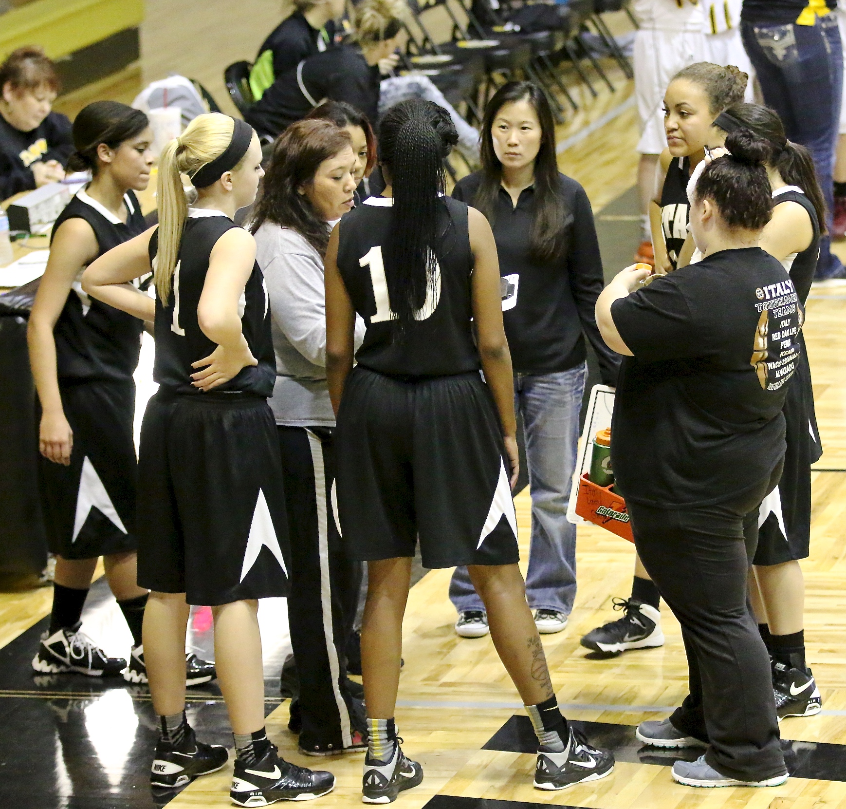 JV Gladiators and JV Lady Gladiators play well in Italy hosted tourney « previous story album next » JV Lady Gladiator head coach Tina Richards (in the grey) and assistant coach Nicole Tindol talk up their squad during a timeout. (Barry Byers) Download original photo