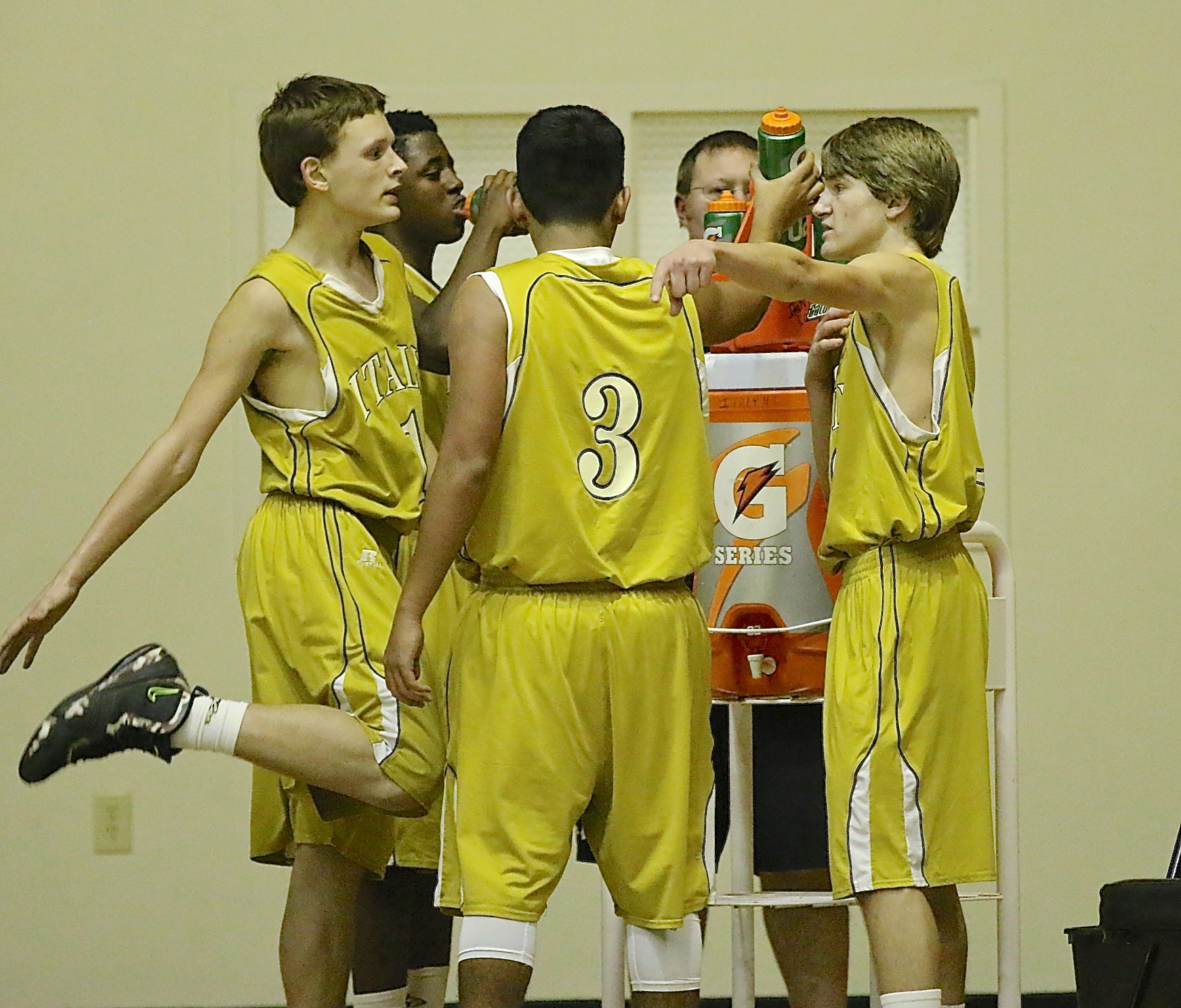 JV and Varsity Gladiators take on Dallas Gateway « previous story album next » Office talk around the water cooler. Joshua Cryer(1), Anthony Lusk(4), Jorge Galvan(3) and Garret Janek(12) talk shop during a break. (Barry Byers) Download original photo