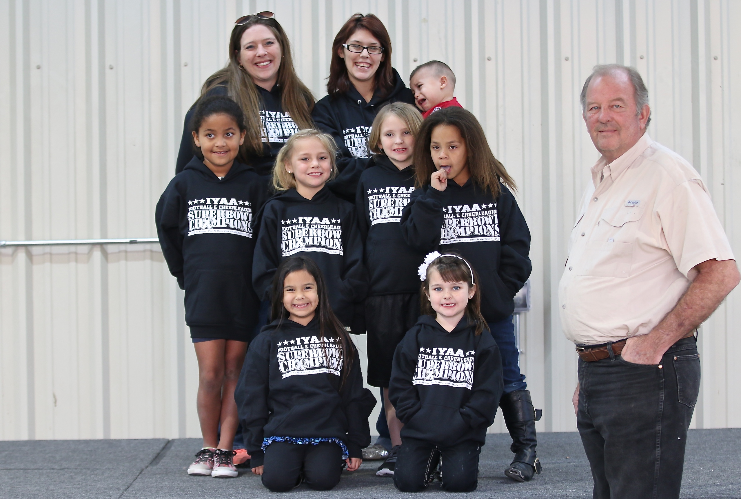 The IYAA C-team cheer coaches and cheerleaders pose with City of Italy’s Mayor James Hobbs who presented the Superbowl Champion cheerleaders with their hoodies. Cheer coaches Kia Hugghins and Lindy Wooldridge are pictured on the back row. The middle row cheerleaders are Mikyla Adams, Charlea Padilla, Lily Hugghins and Shay Johnson. Front row cheerleaders are Jordynn Wiser and Sorienna Maynard. (Barry Byers)