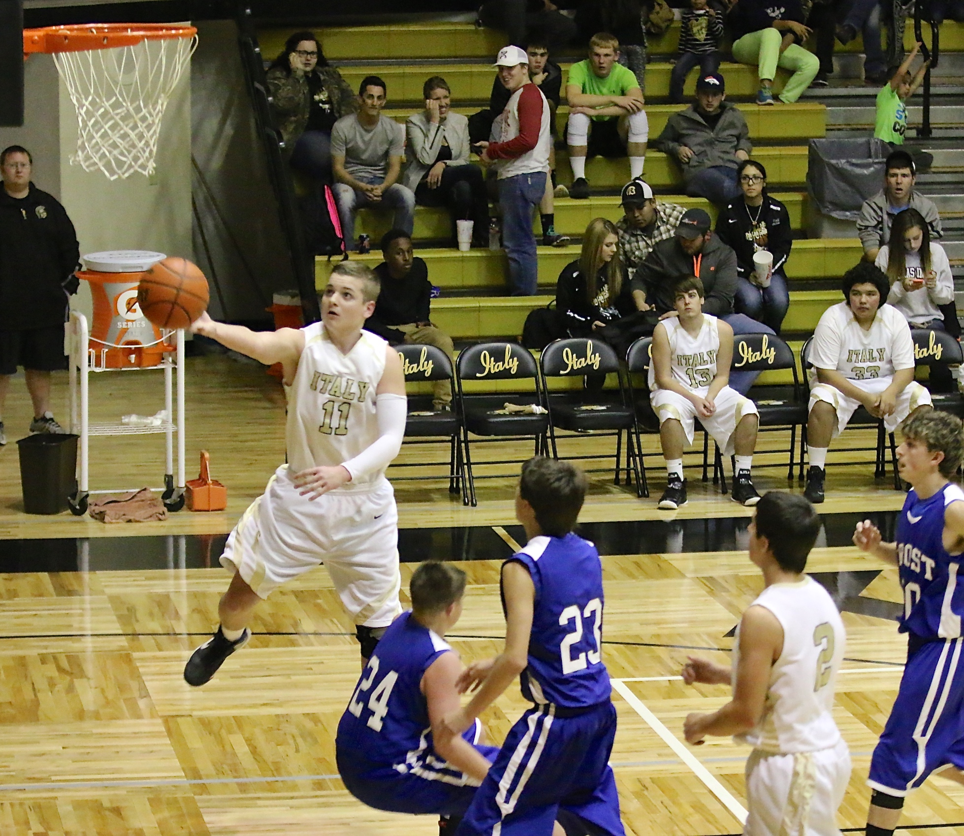JV Gladiator James Walton(11) underhands in a tough shot over a Frost defender. Fueled by Walton’s 16-point night, Italy’s JV took control early and coasted to a 46-25 win. (Barry Byers)