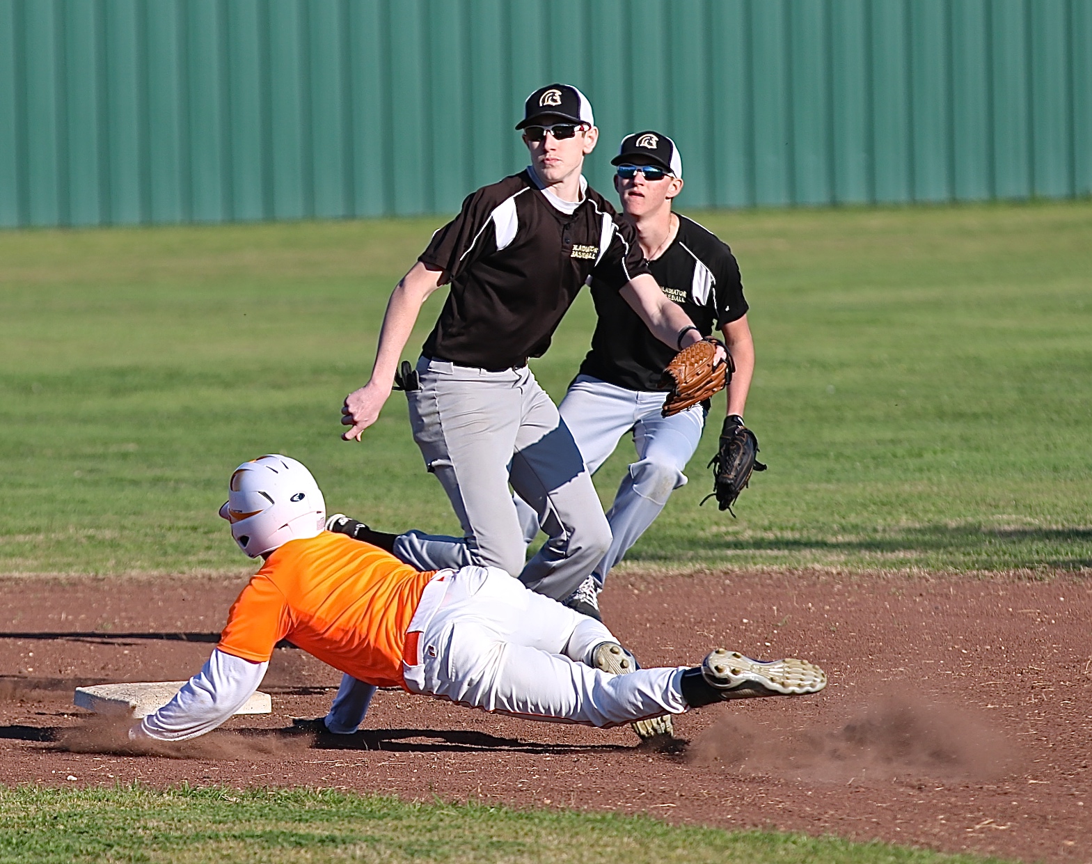 Armor up! Gladiator Baseball enjoys fun in the sun during scrimmage with Avalon « previous story album next » Clayton Miller is on the receiving end of a throw down attempt with teammate Hunter Ballard backing up the throw. (Barry Byers) Download original photo
