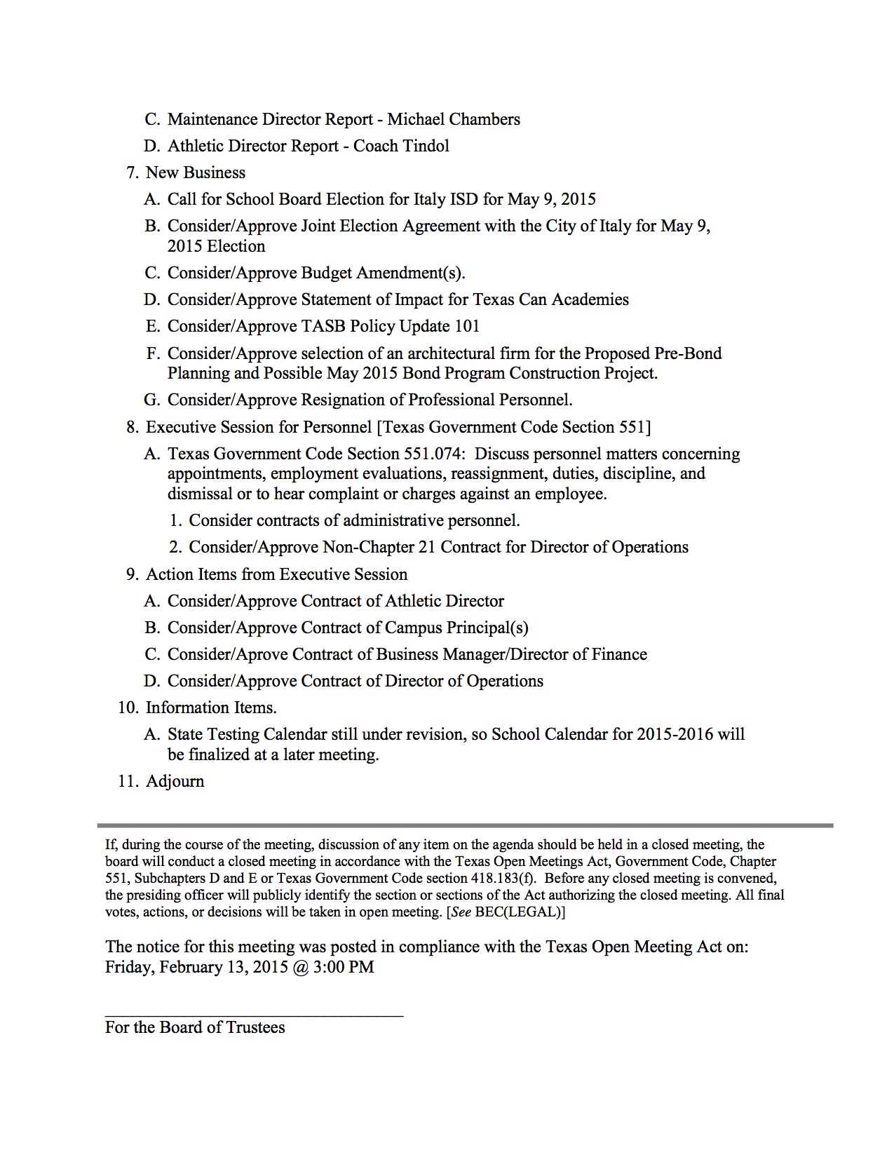Agenda: Italy ISD School Board Meeting – Monday, February 16, 2015 « previous story album next » Agenda – page 2 Download original photo