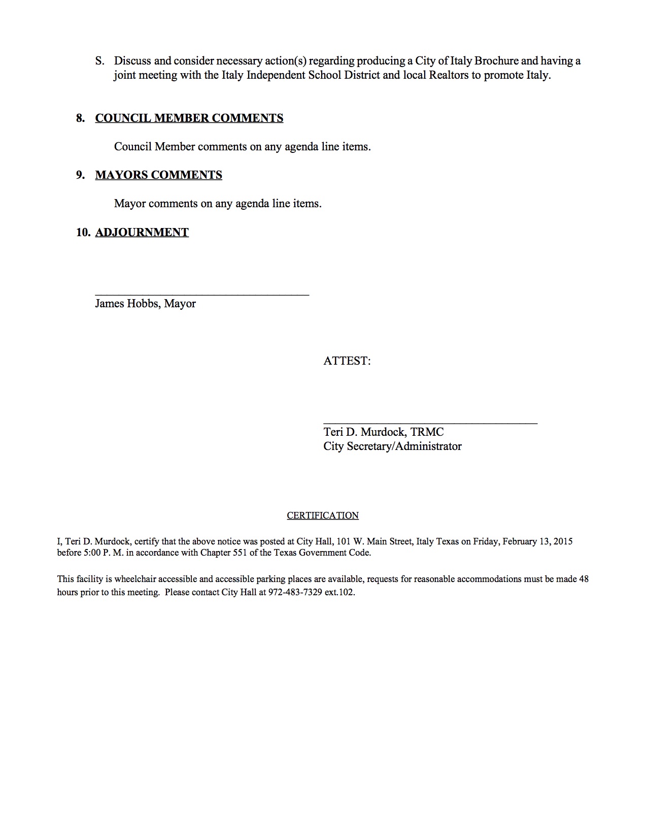 Agenda: Italy City Council Called Meeting – Monday, February 16, 2015 « previous story album next » Agenda – page 3 Download original photo