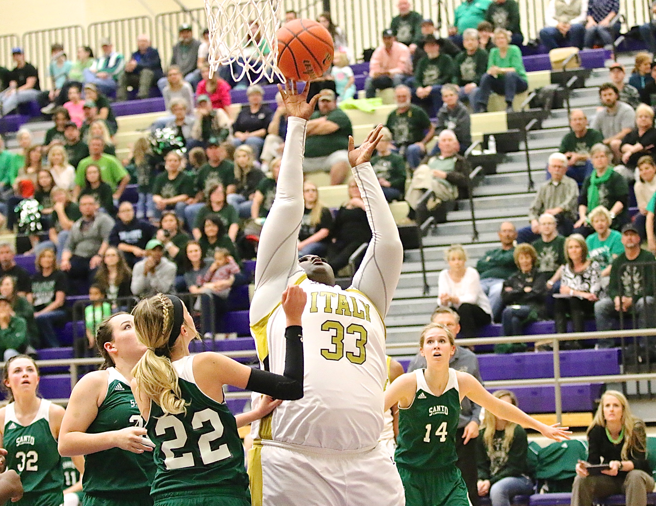 Italy Lady Gladiators drop a heartbreaker to Santo at Area, Lady Cats win 57-52 « previous story album next » Lady Gladiator Cory Chance(33) scores from the low block with little resistance from Santo. (Barry Byers) Download original photo