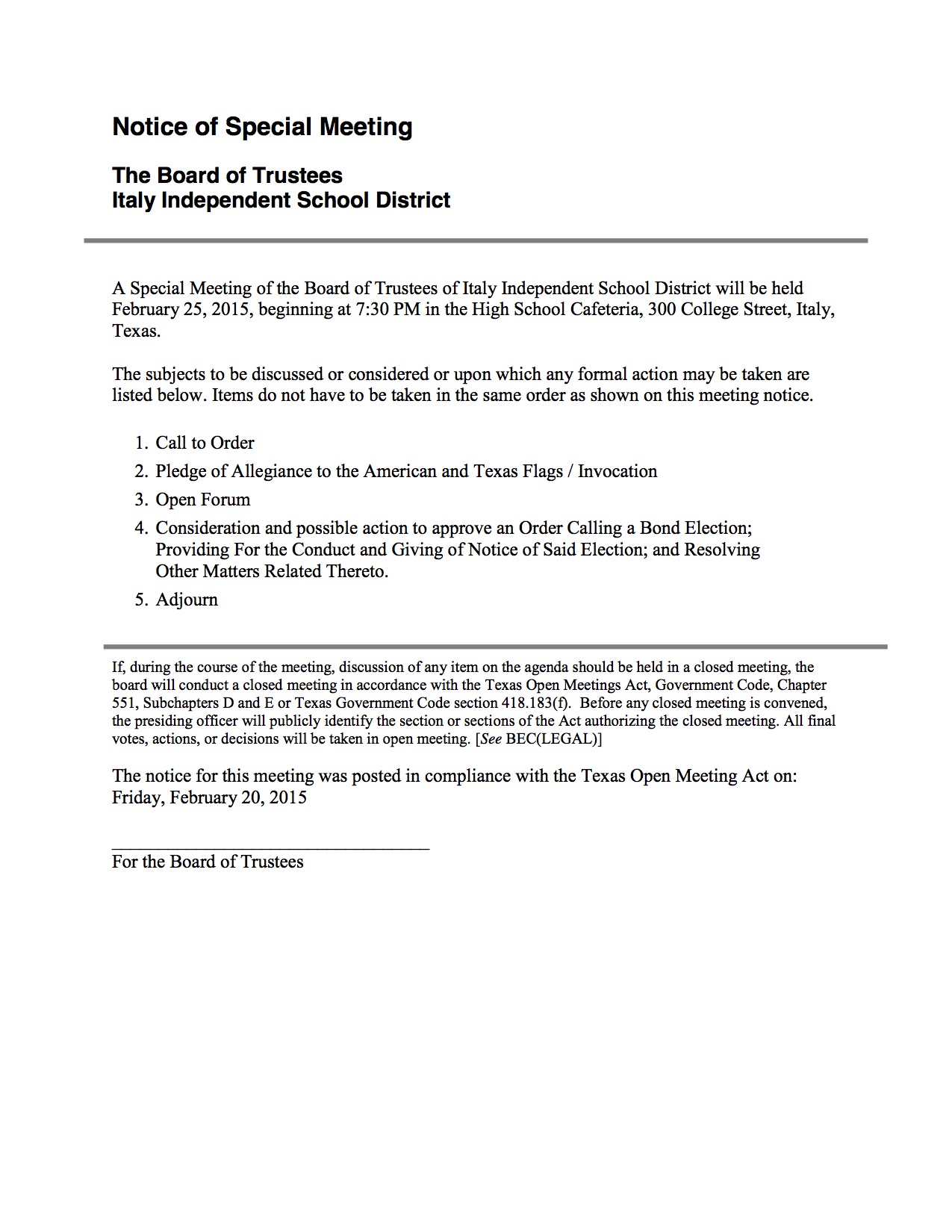 Agenda: Italy ISD School Board Called Meeting – Wednesday, February 25, 2015 « previous story album next » Download original photo