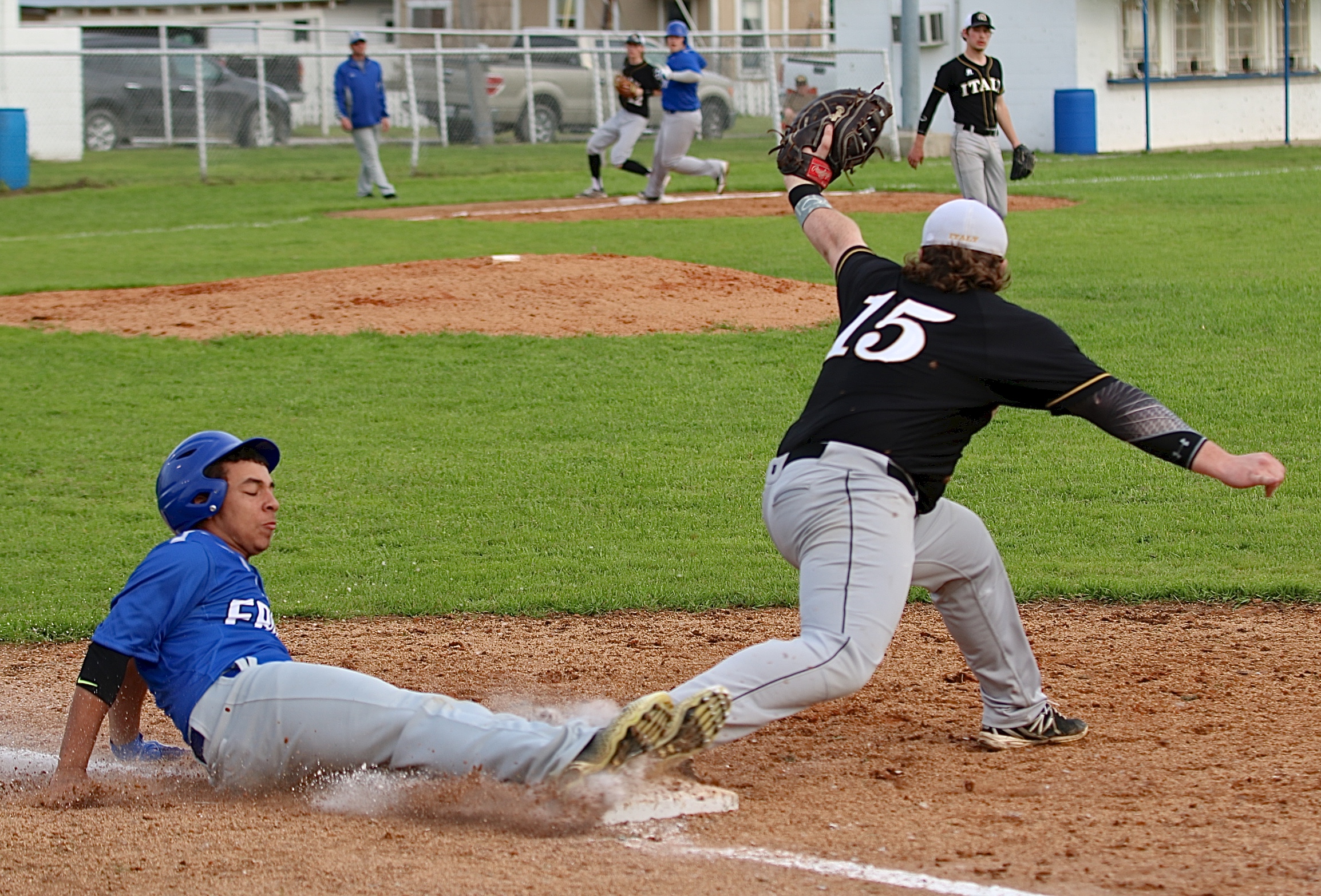 Gladiator stand 2-2 in district standings with plenty of baseball still to play « previous story album next » Gladiator senior Tyler Vencill(15) tries to catch the ball in time to stop a Frost runner from sliding safely across the first-base bag. (Barry Byers) Download original photo