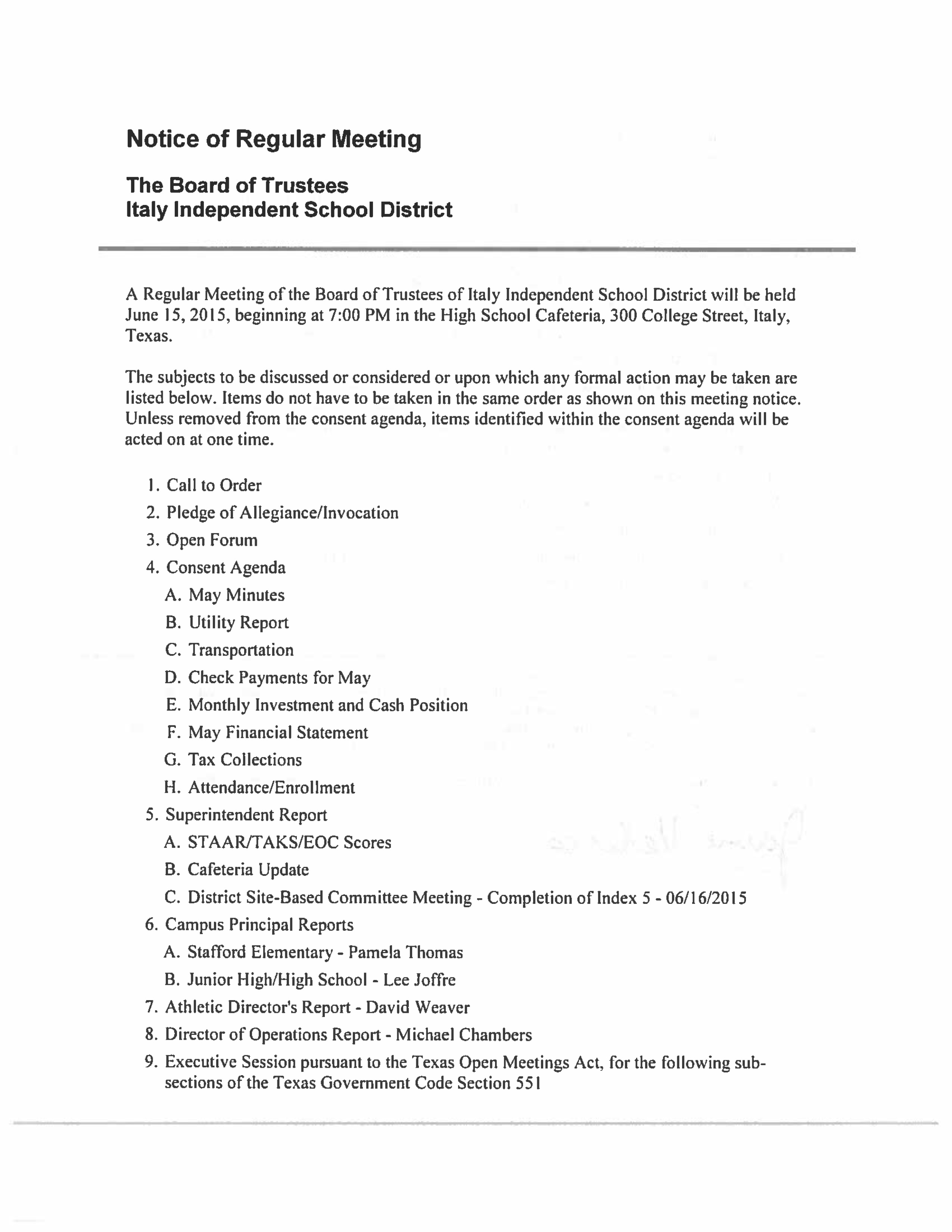 Agenda: Italy ISD School Board meeting – Monday, June 15, 2015 « previous story album next » Agenda – page 1 Download original photo