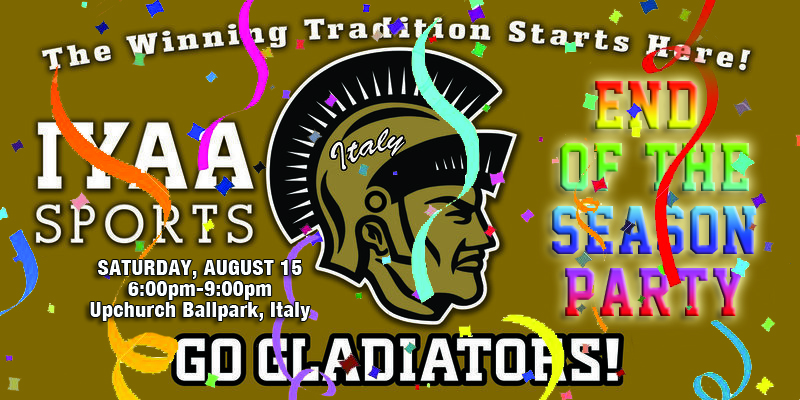 The Italy Youth Athletic Association (IYAA) will be hosting its End of Season Party on Saturday, August 15, from 6:00 p.m. to 9:00 p.m. at the Upchurch Ballpark. It will also be a great time to signup for football and cheerleading which starts at 5:00 p.m.