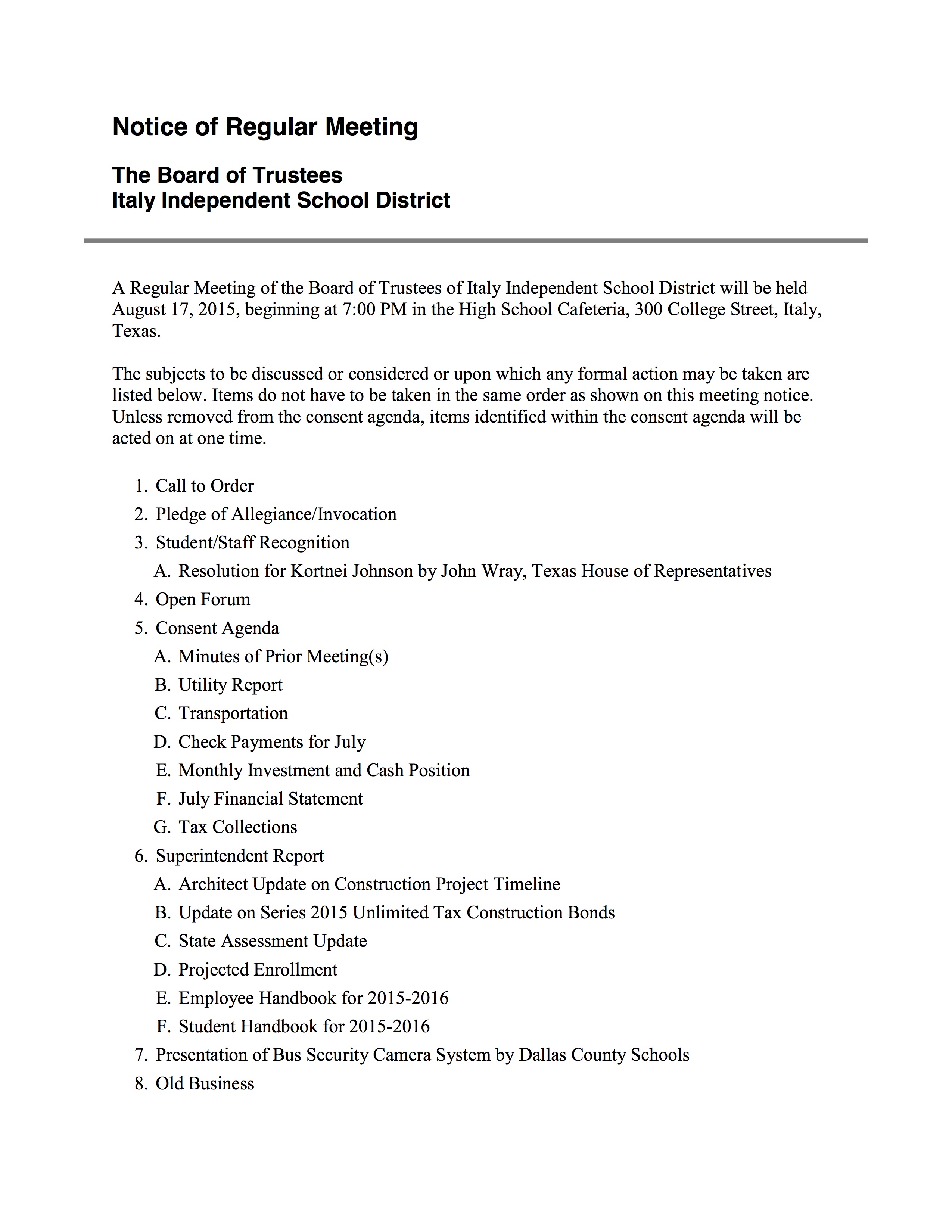 Agenda: Italy ISD School Board Meeting – Monday, August 17, 2015 « previous story album next » Download original photo