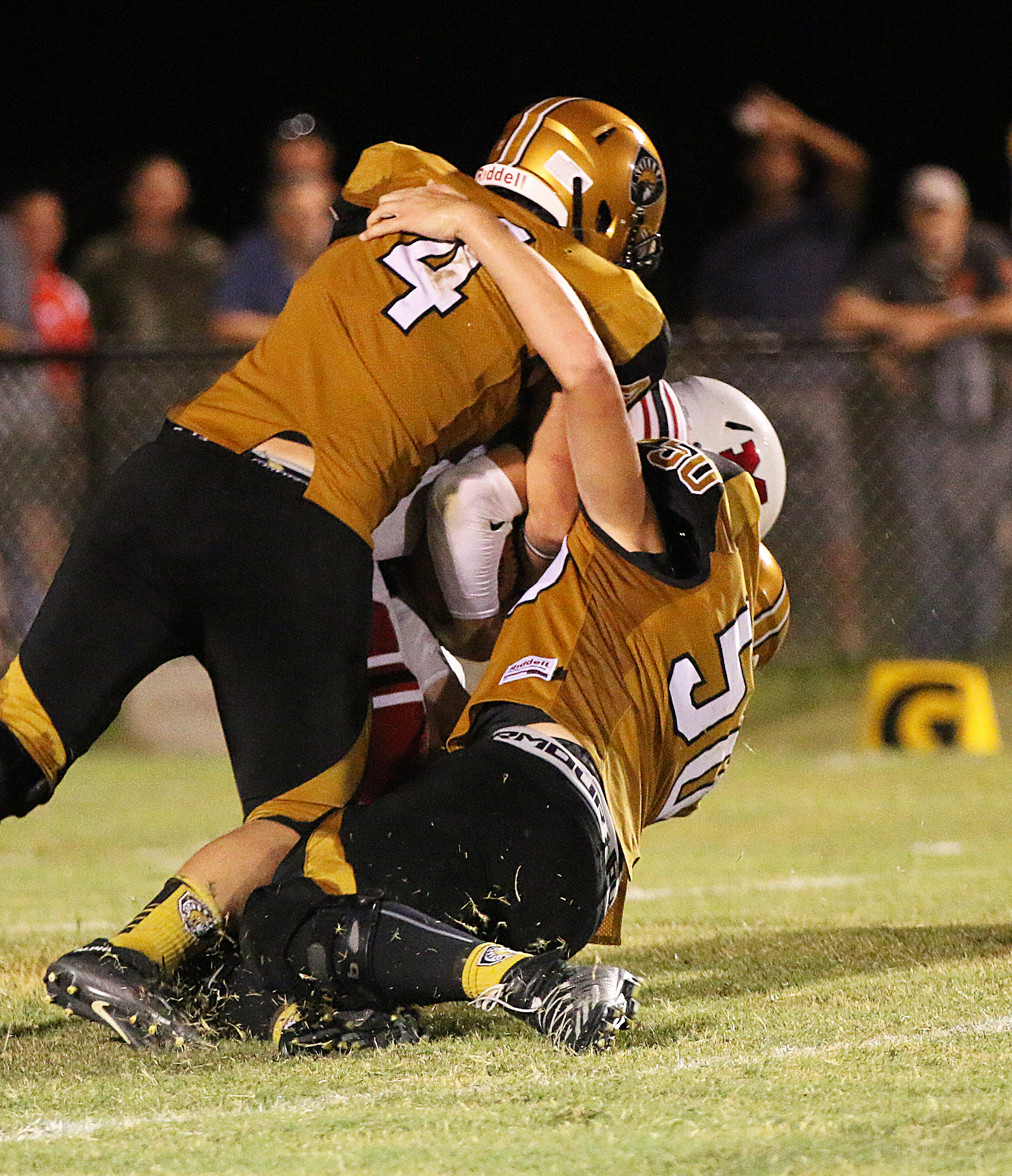 Italy Gladiators show promise under new leadership of AD/HFC David Weaver « previous story album next » Gladiator defenders Micah Escamilla(4) and Clay Riddle combine for a tackle in Maypearl’s backfield. (Barry Byers) Download original photo