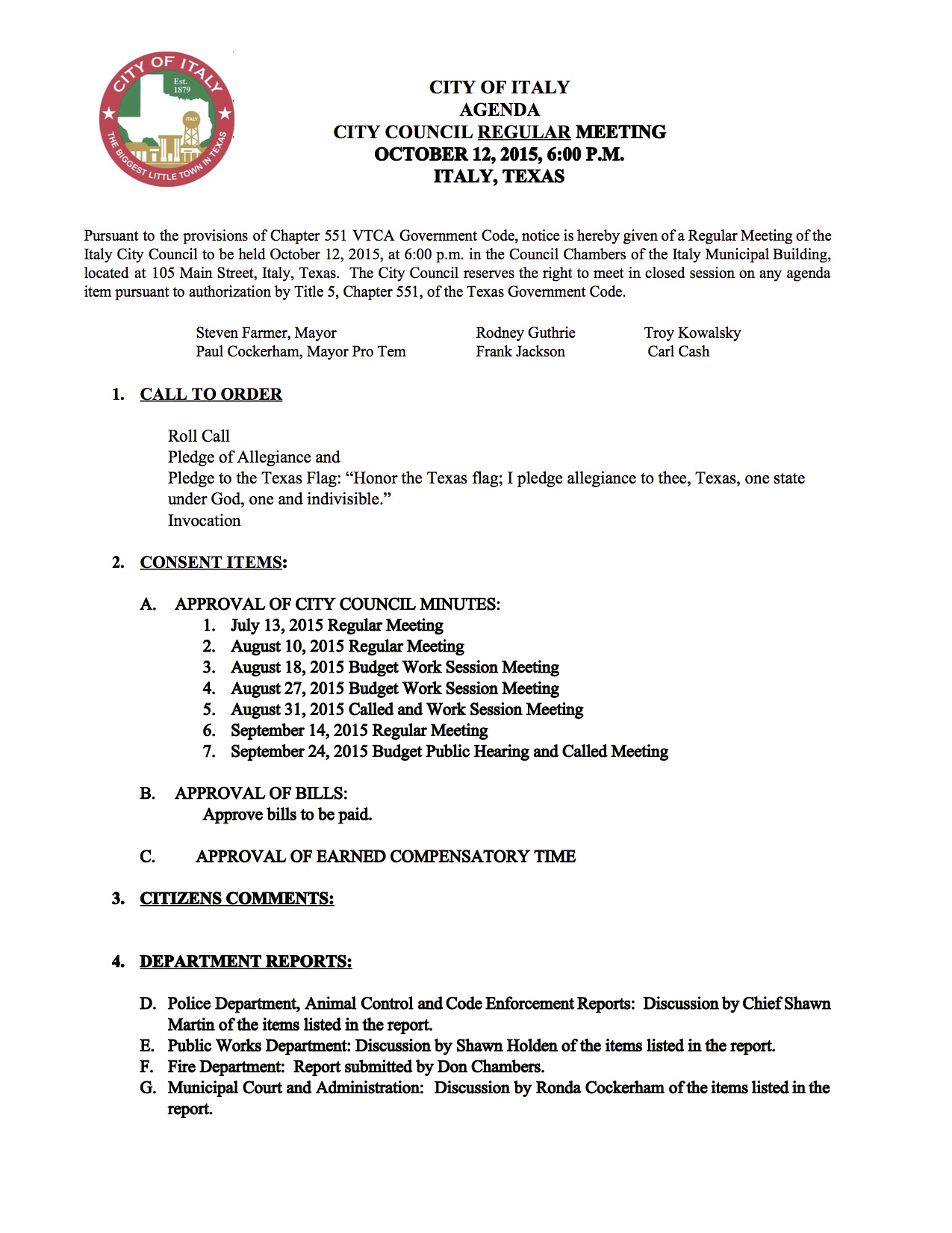 Agenda: Italy City Council Meeting — Monday, October 12, 2015 « previous story album next » Download original photo