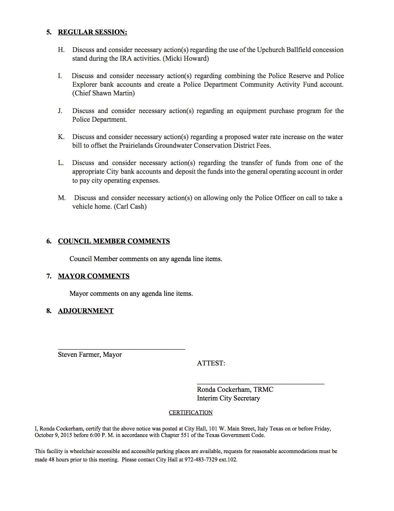 Agenda: Italy City Council Meeting — Monday, October 12, 2015
