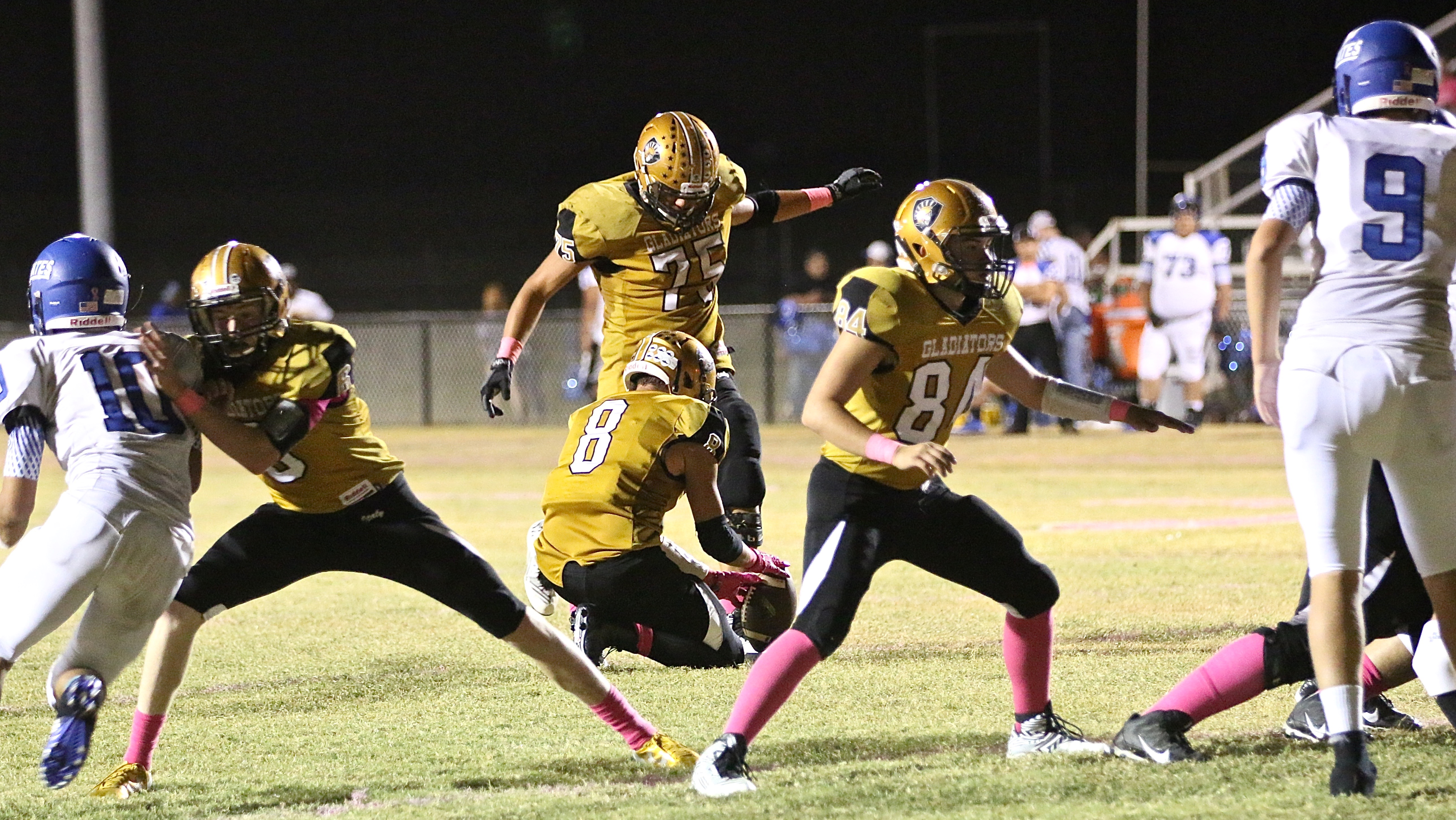 Gladiators bombard the Chilton Pirates 34-27 to stay undefeated in district « previous story album next » David De La Hoya(75) boots thru the PAT with Joe Celis holding and with Clayton Miller(6) and Eli Garcia(84) blocking. (Barry Byers) Download original photo