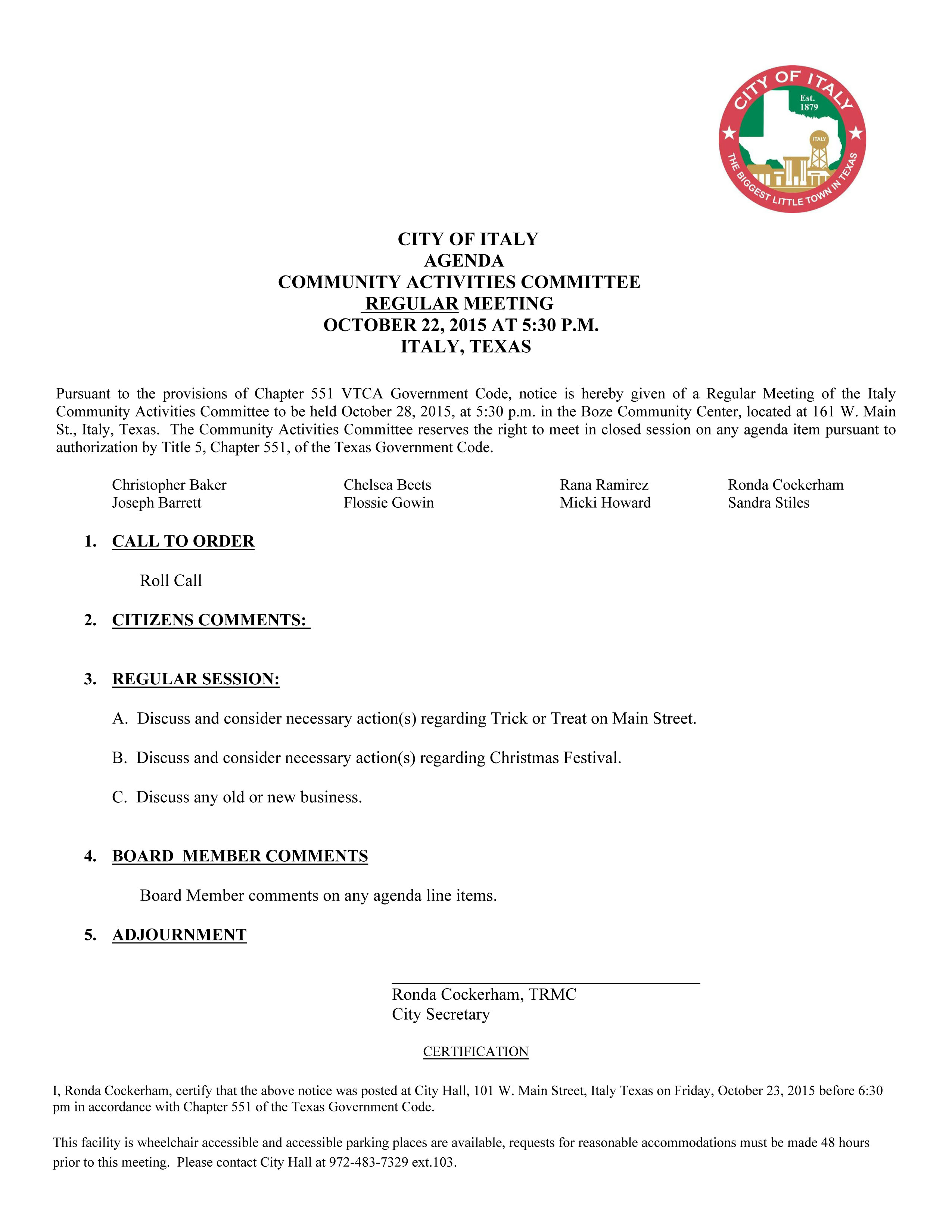 Agenda: italy Community Activities Committee Meeting-Wednesday, October 28, 2015 « previous story album next » Download original photo
