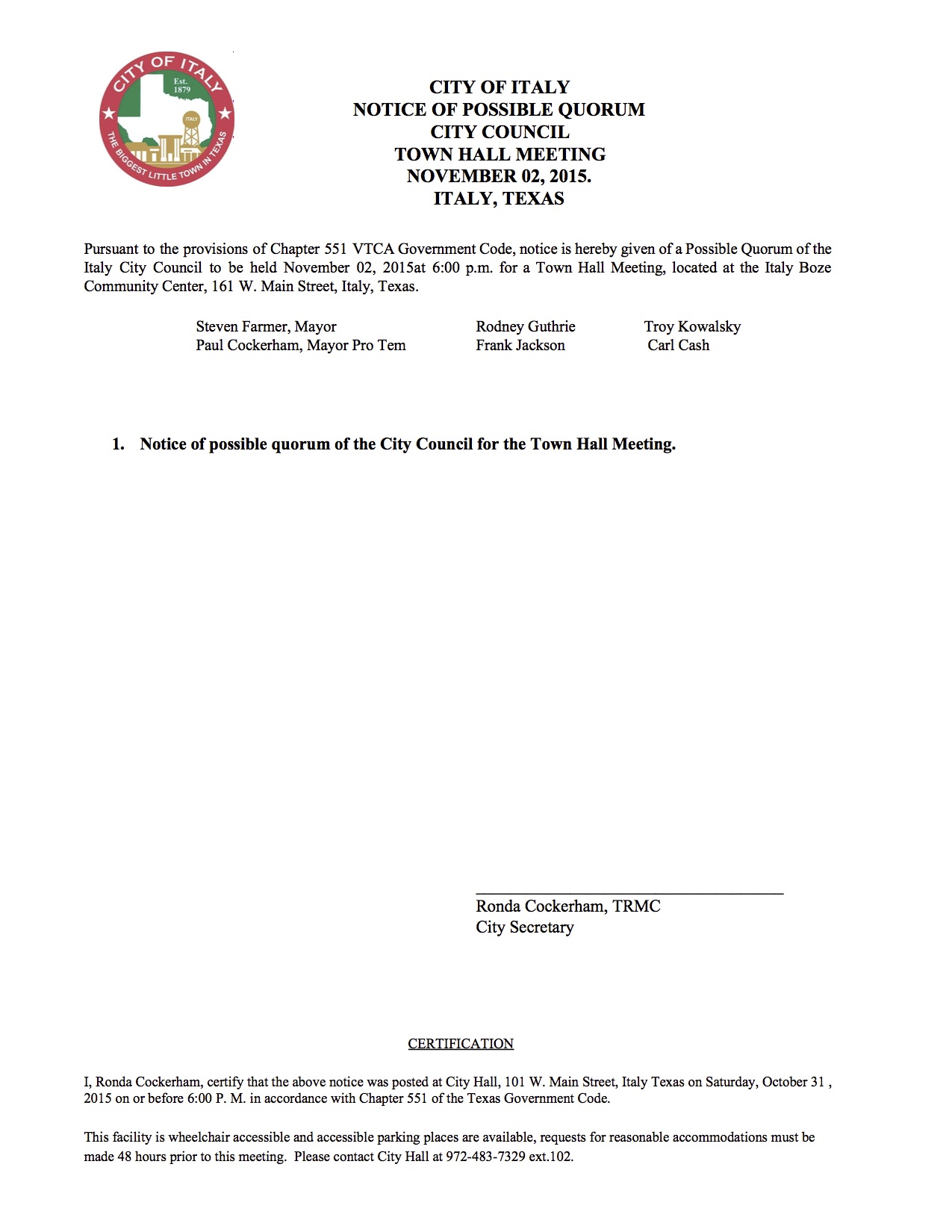 Italy Town Hall Meeting scheduled for tonight