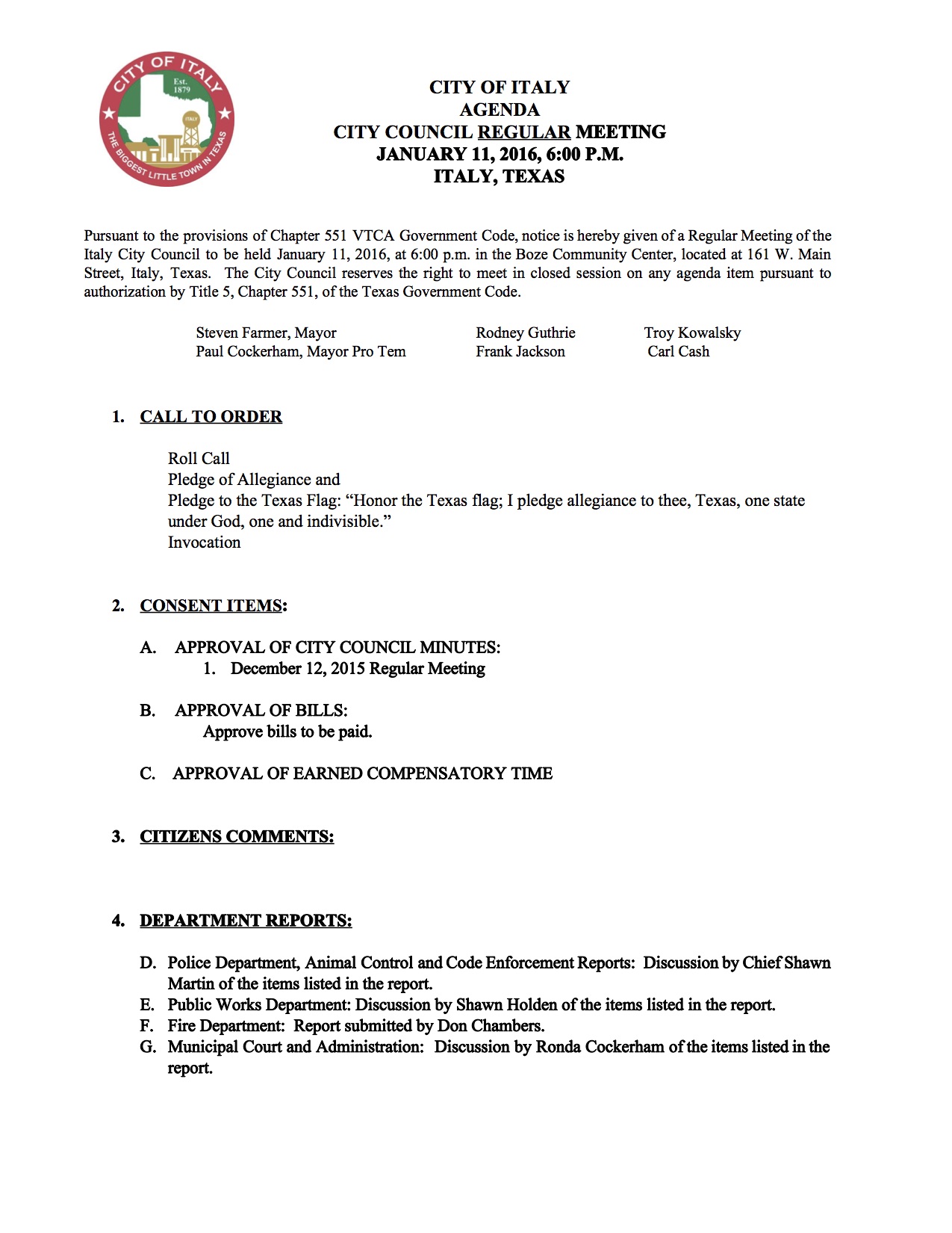 Agenda: Italy City Council Meeting — Monday, January 11, 2016 « previous story album next » Agenda – page 1 Download original photo