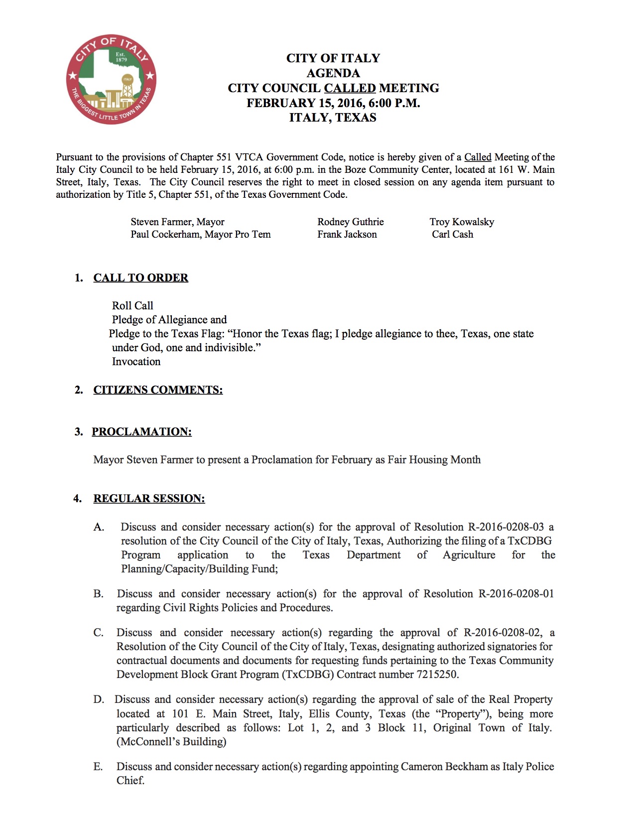 Agenda: Italy City Council Called Meeting — Monday, February 15, 2016 « previous story album next » Agenda – page 1 Download original photo