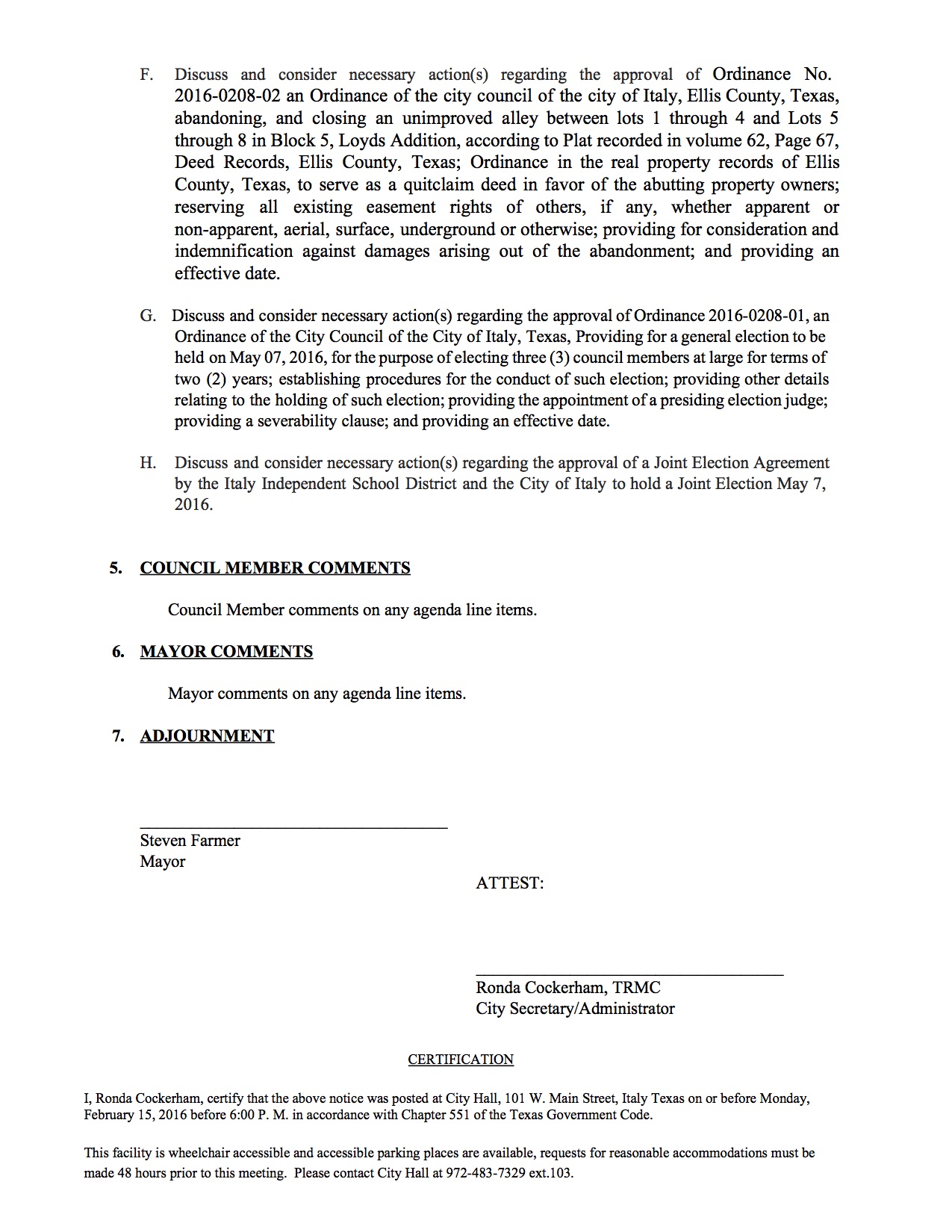 Agenda: Italy City Council Called Meeting — Thursday, February 18, 2016 « previous story album next » Download original photo
