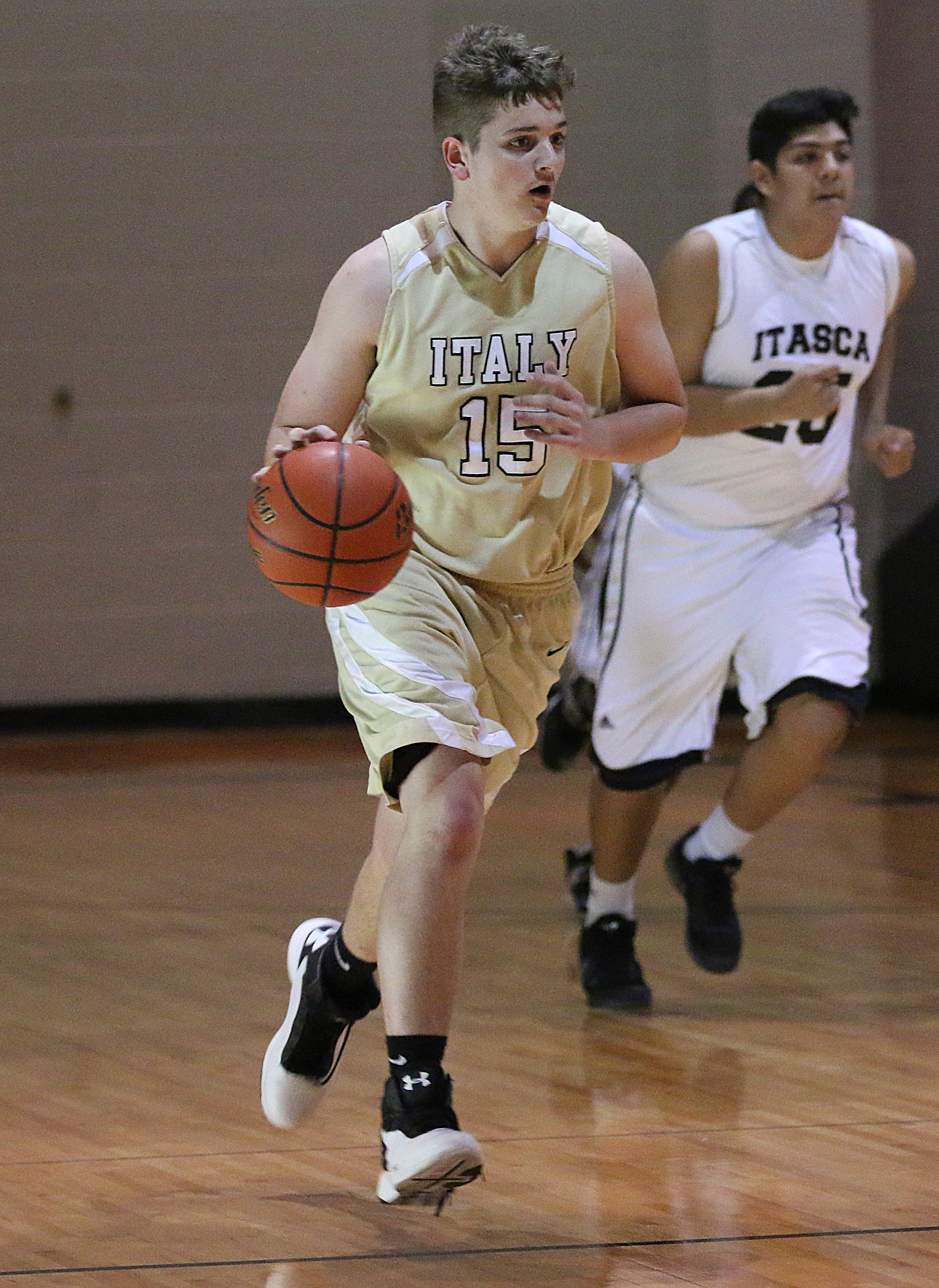 Gladiators seal the district deal with a 60-45 win over Itasca. PLAYOFFS!!! « previous story album next » Italy JV Gladiator James Walton(15), the big man, shows his dribbling skills while controlling the ball. (Barry Byers) Download original photo