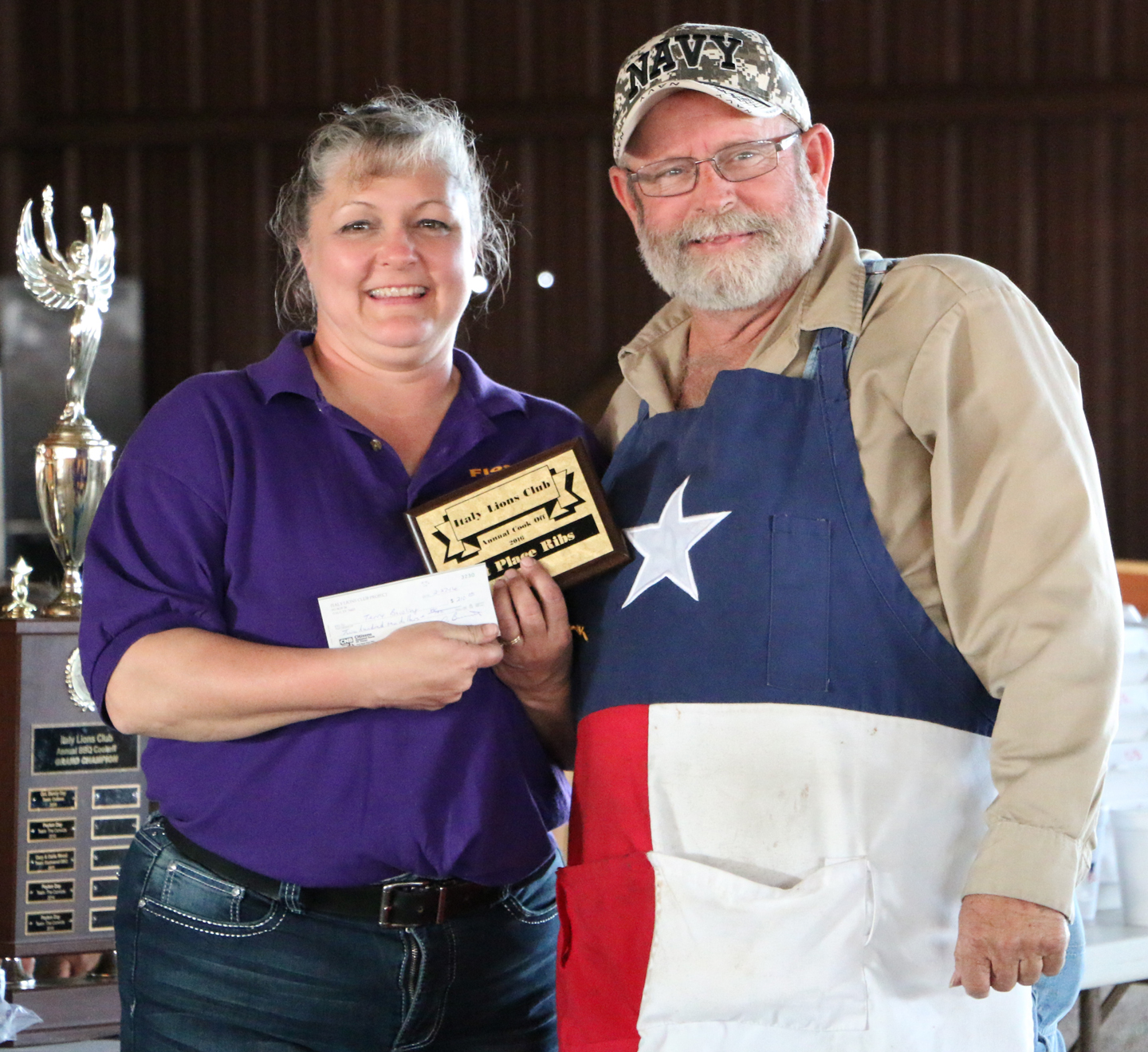 Italy Lions Club member Flossie Gowin presents Terry Bowling, of Blooming Grove, with his 1st Place Ribs plaque and his $210.00 winner’s check. Mr. Bowling was also the cook-off’s Grand Champion, was awarded 3rd Place in the Chicken category, received 4th Place in the Brisket category, and received 6th Place in the Pork Butt category. He dedicated his accomplishments to his wife of 19 years, Glenda Ann Bowling (1953 – 2016), who passed away just two weeks before the cook-off. (Barry Byers)