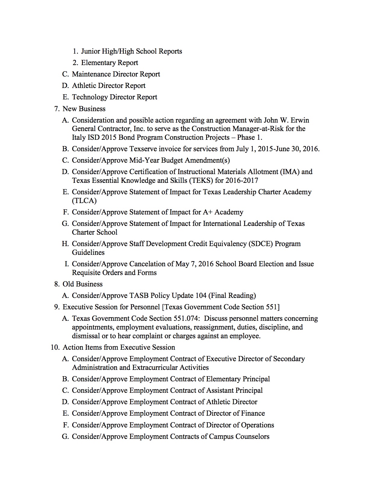 Agenda: Italy ISD School Board Meeting – Monday, March 21, 2016 « previous story album next » Agenda – page 2 Download original photo