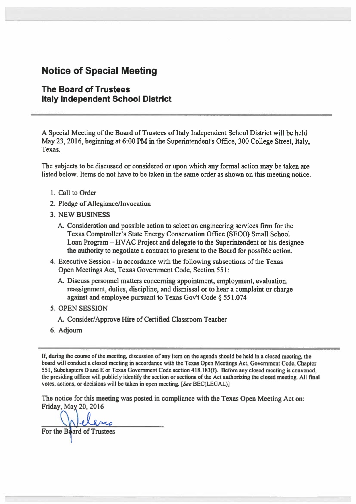 Agenda: Italy ISD School Board Called Meeting—Monday, May 23, 2016 « previous story album next » Download original photo
