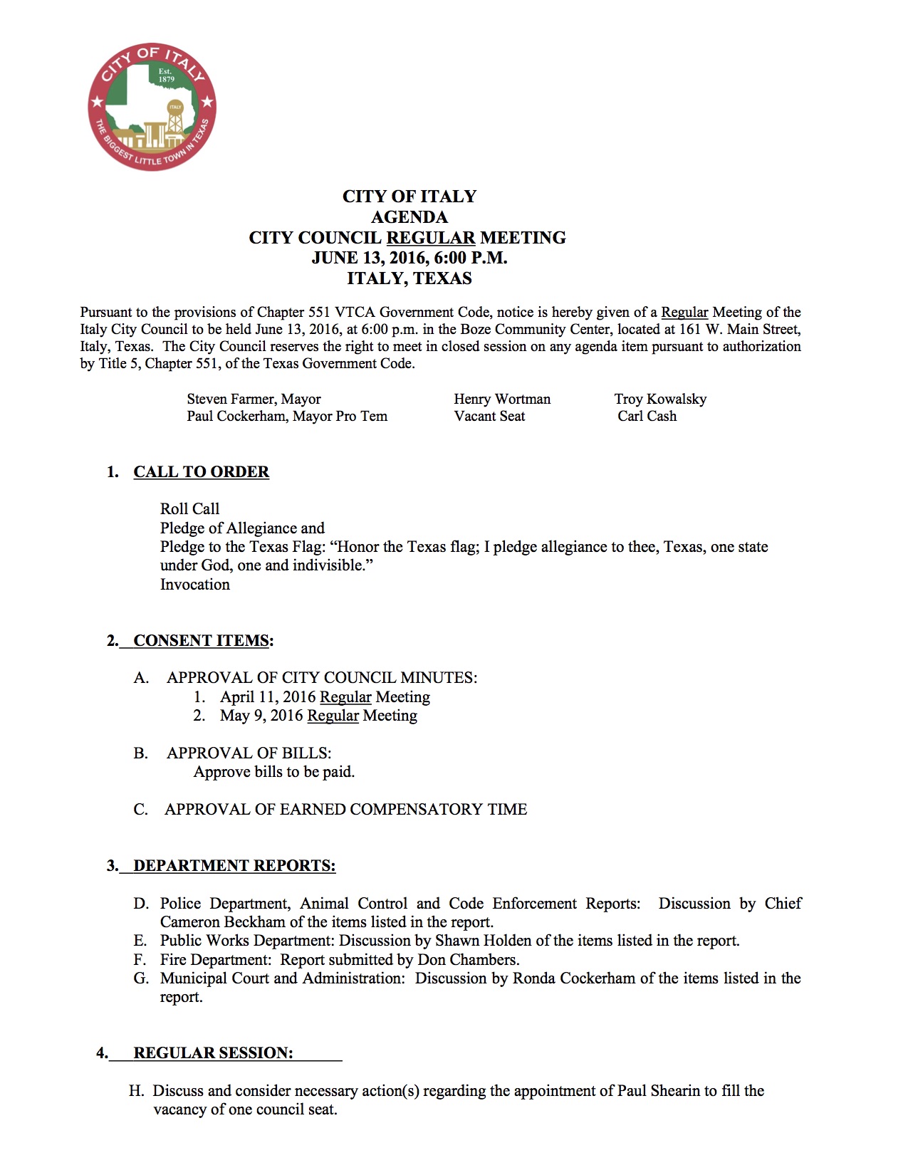 Agenda: Italy City Council Meeting — Monday, June 13, 2016 « previous story album next » Agenda – page 1 Download original photo