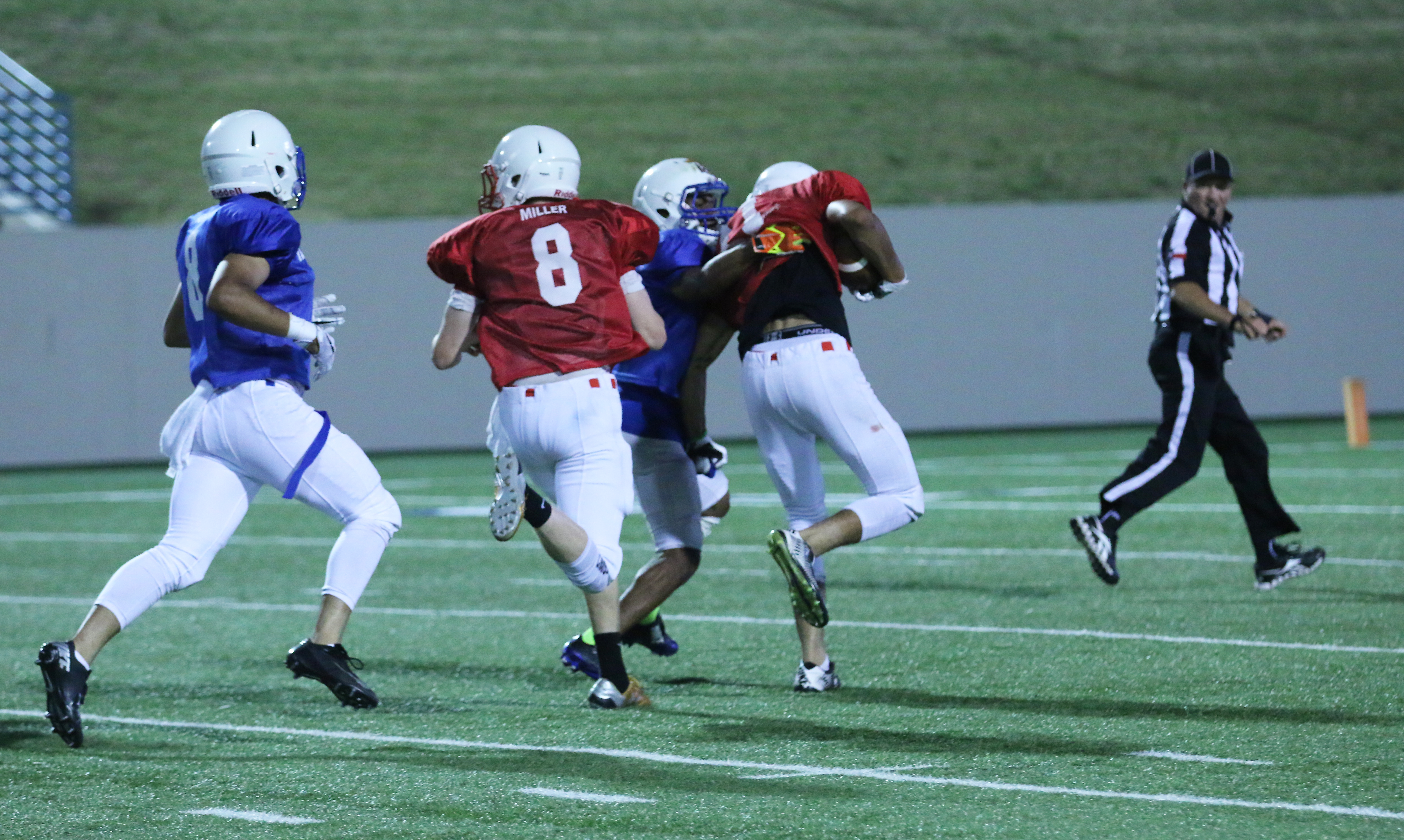 Italy’s Clayton Miller(8) turns blocker as he tries to help his receiving teammate reach the endzone with 1:10 left in the contest. Miller’s Red squad trailed 7-6 when this play covered over 50 yards to setup a possible game-winning field goal. (Barry Byers)