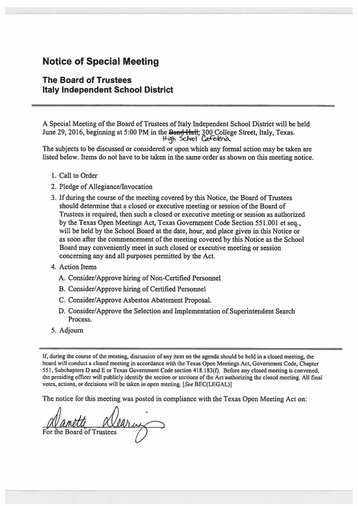 Agenda: Italy ISD School Board Called Meeting – Wednesday, June 29, 2016 « previous story album next » Download original photo