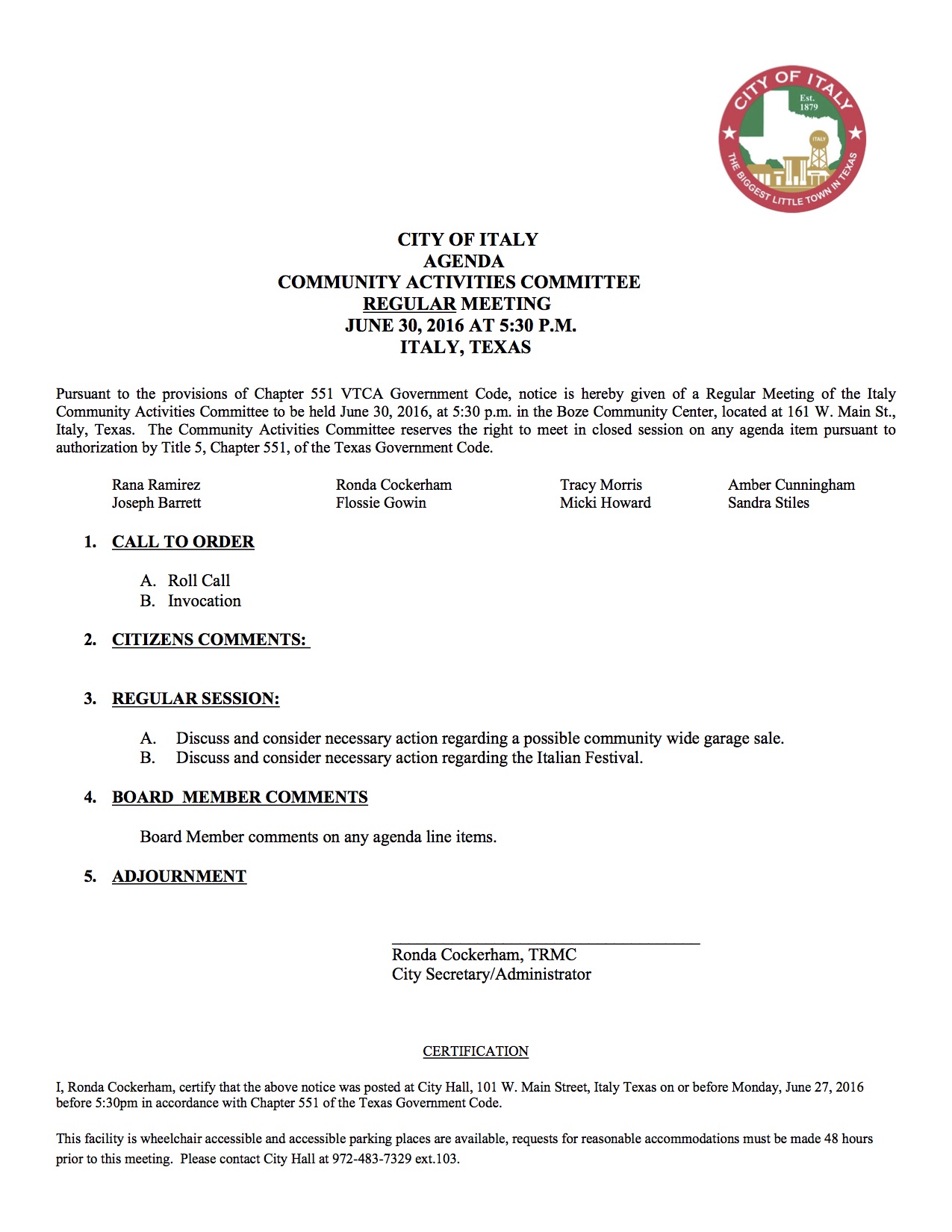 Agenda: Italy Community Activities Committee Meeting—Thursday, June 30, 2016 « previous story album next » Download original photo