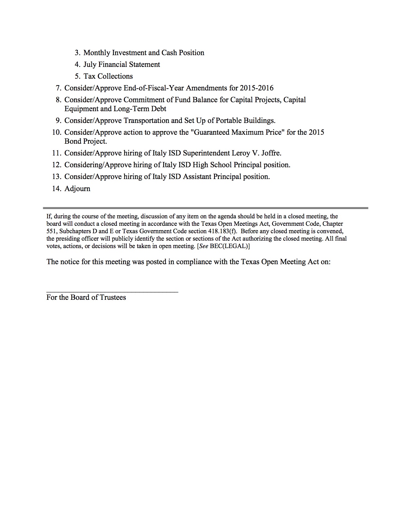 Agenda: Italy ISD School Board Meeting — Tuesday, August 9, 2016 « previous story album next » Agenda – page 2 Download original photo