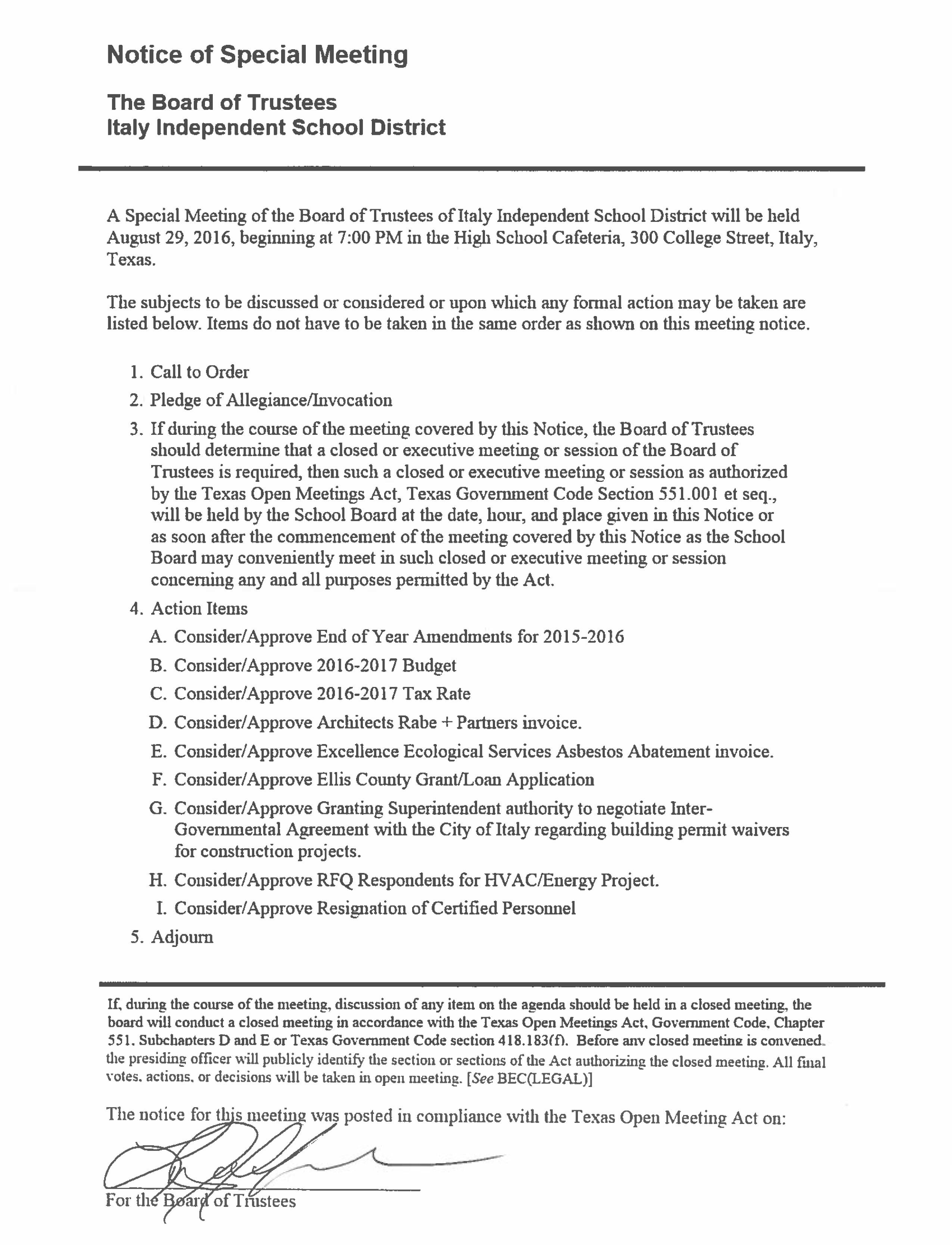 Agenda: Italy ISD School Board Called Meeting — Monday, August 29, 2016 « previous story album next » Download original photo
