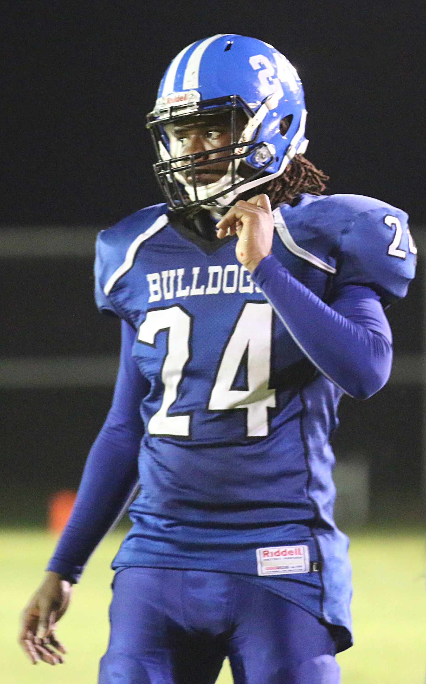 Milford starts out 1-1 after taking on a pair of state-ranked teams in 6-man « previous story album next » Milford’s senior lineman #24 Jarvis Harris, the biggest Bulldog on the roster at 210 pounds, buckles up to make a defensive stand. (Barry Byers) Download original photo